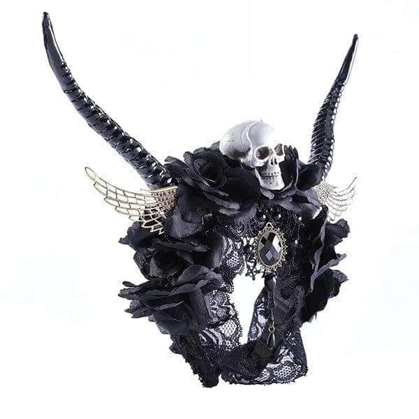 Complete your gothic Lolita outfit with this stunning statement Antelope Horn Headdress for a gothic wedding, Halloween party, or festival. The fantasy headpiece is made of roses, lace, gems, and plastic horn.