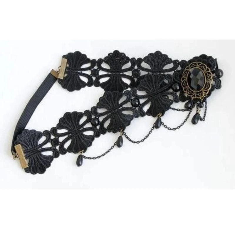 Stop hearts and drop jaws with these Aurora Punk Vintage Lace Headband. Constructed with a high-quality lace strap adorned with vintage-looking rhinestones and chains. Before you head out to haunt, pop this absolutely adorkable beaded headband in your ‘do to add a spoonful of elegance and charm to your look.Â