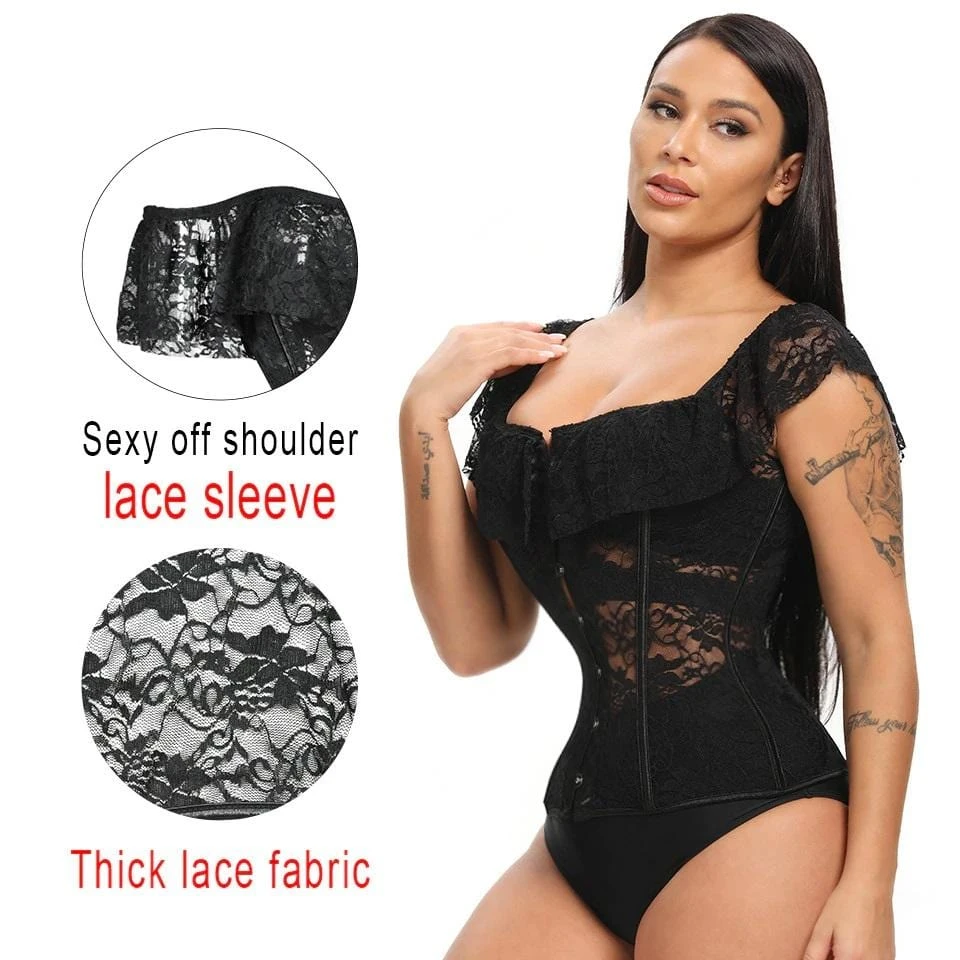 Thick yet airy and delicate floral lace fabric pair in this “Bella” Off Shoulder Lace Corset to give your curves a little love with plenty of dark sweetness. Finished with a delicate sexy off shoulder lace sleeve, classic buckle closure to the front and an underbust elastic band plus 6 plastic bones for the waist to look oh so curvy and slim.