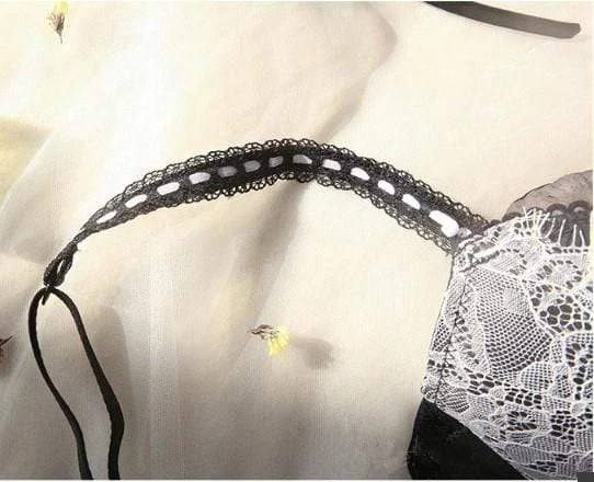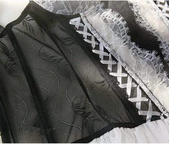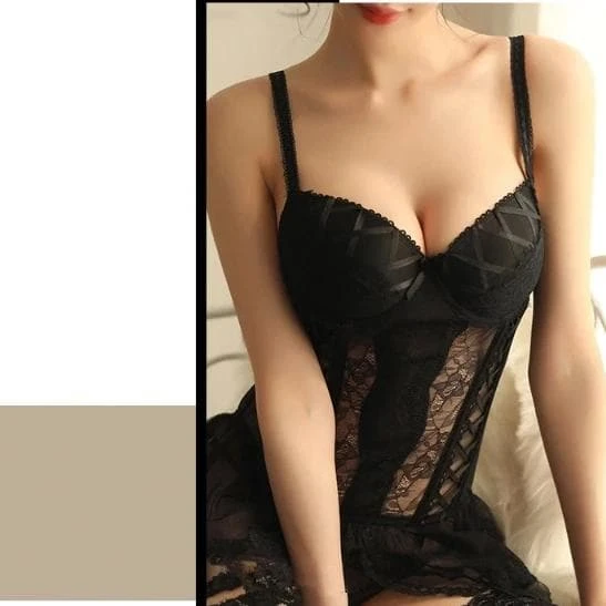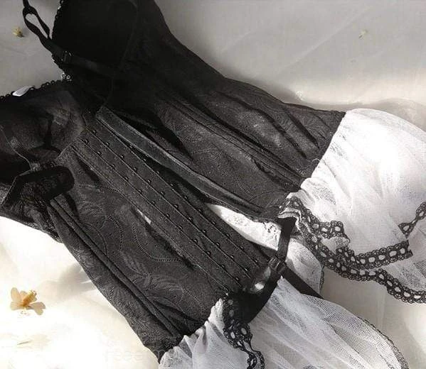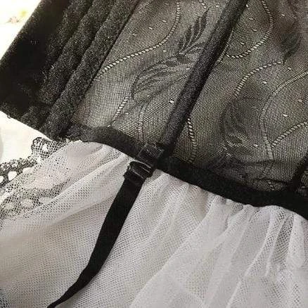 This semi transparent lace intricately cut and sewn to overlay the solid black base on half the corset breast cups and ribbed front panels along with the overlay criss-cross lacing completing this element. The delicate lace design used for the shoulder straps is also added to the bottom edges of the two layered nylon skirting. Also included is a precious matching thong.