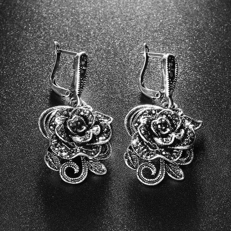 The ‘Black Rose’ silver vintage earrings – combined with rhinestone crystals and silver antique finish hardware. Large yet lightweight to ensure comfortable wear. Perfect for adding a lil’ extra darkness to yer fav looks!
