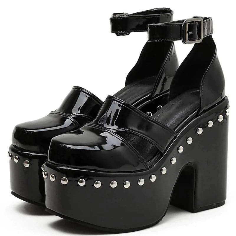 Walk on the dark side in these shiny Blaque Rivet Platform Shoes, made of premium vegan leather! Possessed with metal rivets and buckle strap closure, these gothic shoes are drop dead gorgeous! Complete with a 5″ chunky heel to give your bootay a helluva lift.