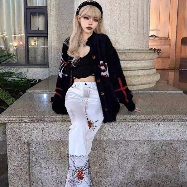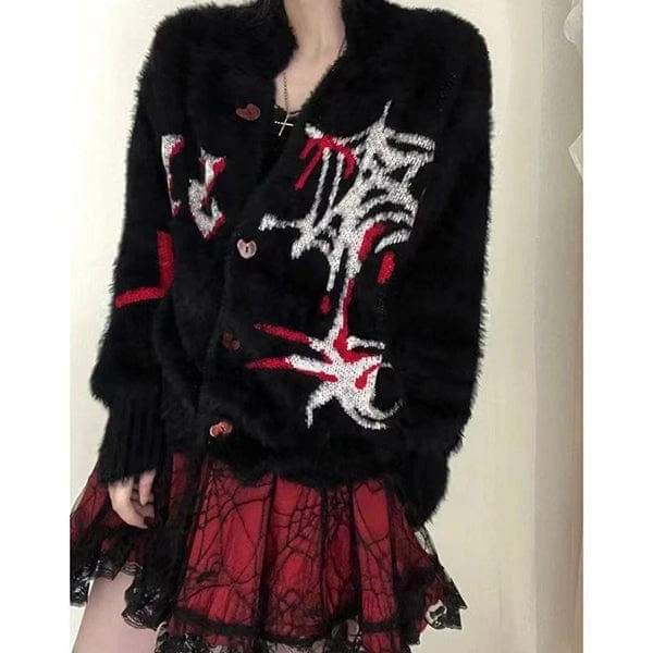 Get ready for winter with help from your favorite wall crawler! This furry button-up cardigan is ready to sling its way into your collection. It features a bloody spider and spider web design with a cross on the sleeve perfect for any arachnid fanatic.
