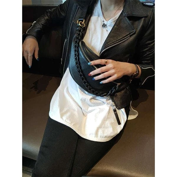It’s impossible not to fall in love with this superb fanny pack, with its ultra-fashionable look. The bag is decorated with an acrylic chain detail on the front attached to its zipper, which gives a raw look but with an exclusive twist.Â
