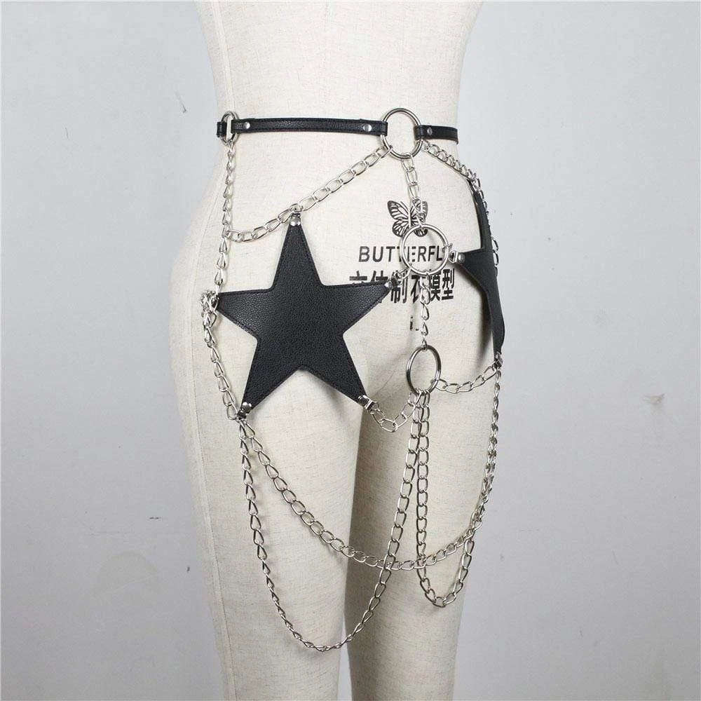 This Chained Star Harness is made on the theme of go big or go home. This harness, by its sheer sizing, is not for the faint of heart to wear. The metal material is combined with faux leather and has several rings to adorn your waist. This one size accessory is adjustable and can be worn by any size.Â