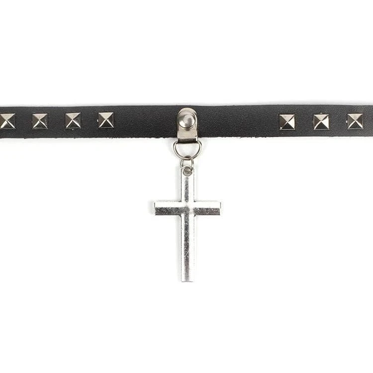 Haunt the night in this studded collar. Silver pyramid studs on the sides, plus a statement center cross. Rock your rebellious side in the genuine leather construction, complete with a silver snap-on closure for the perfect fit.