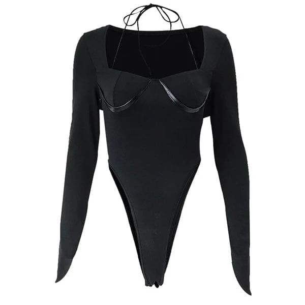 Keep it edgy and comfy by adorning this long-sleeve bodysuit. Crafted with polyester and spandex, embellished with faux leather patchwork on the bust, featuring a halter self-tie at the back of the neck, elongated sleeves, a slim-fit silhouette, and an ultra high-leg cut followed by snap-button closures. Complete the stylish look with a pair of denim pants.