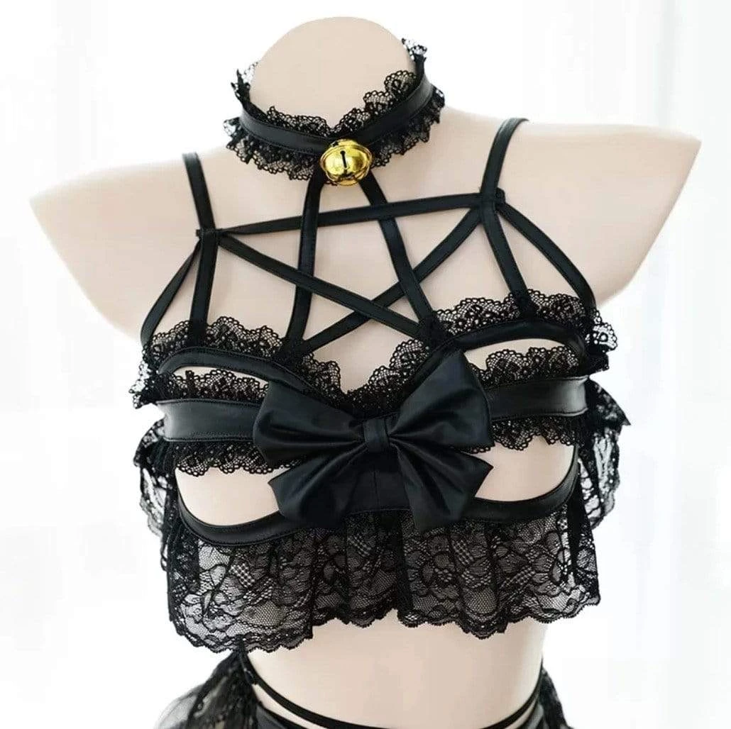Adorn yourself in this beautiful piece of clothing that mixes Faux leather and lace to give you the best experience. The two bows are placed to give it all the feels while the criss crossing pentagram on the neck warns that you are surely Satan’s favorite girl. Do not miss the details of the lace on the cup and the mesh skirt that is skimpy enough to light anyone on fire.Â