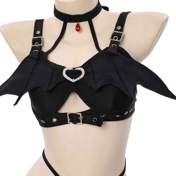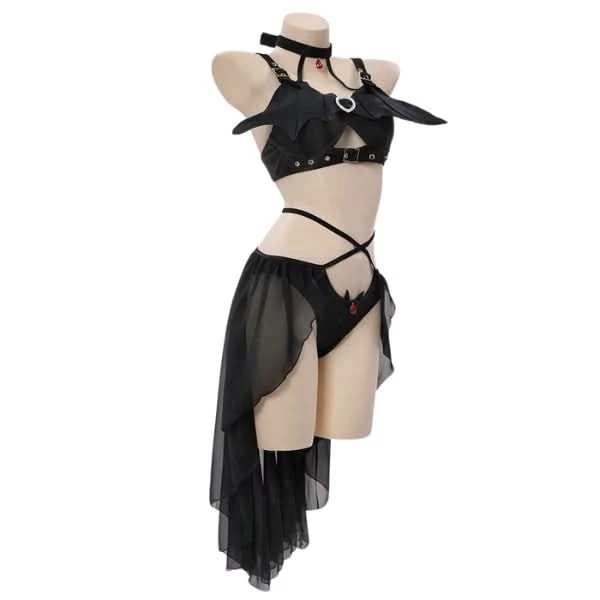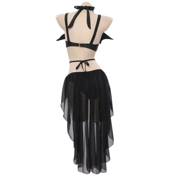 Stand out with this Gothic black bat wing lingerie set featuring a sheer chiffon skirt. Perfect for cosplay or special occasions, it’s bold, stylish, and unique.