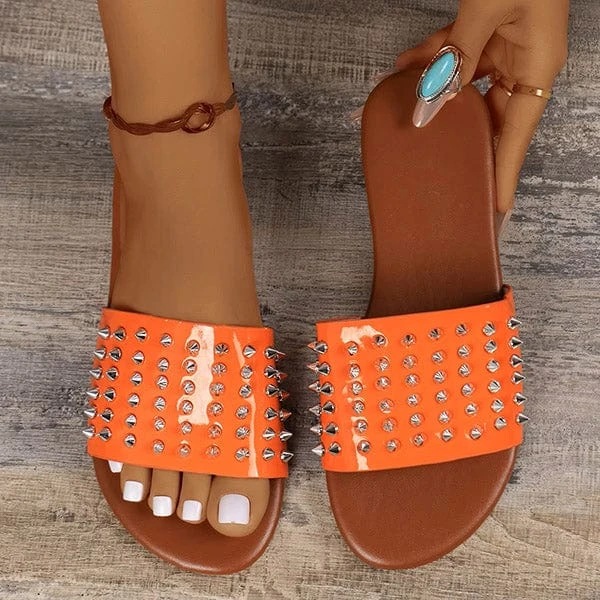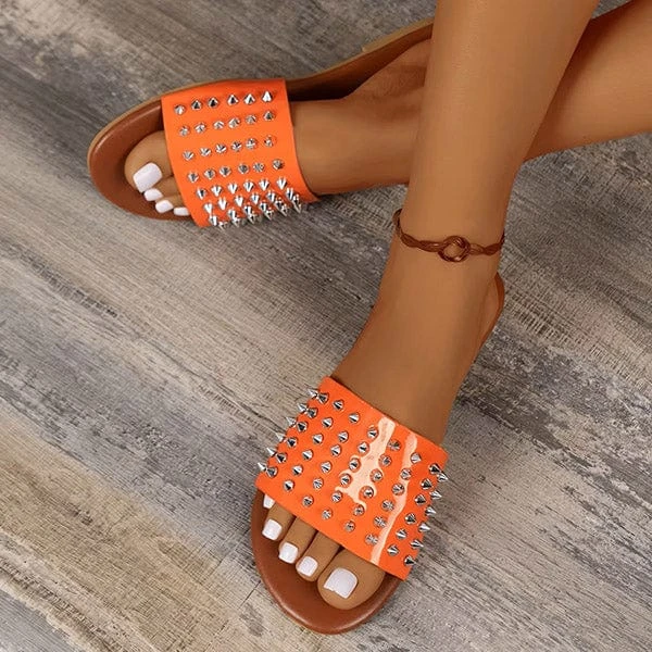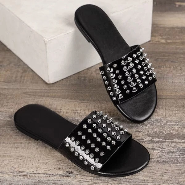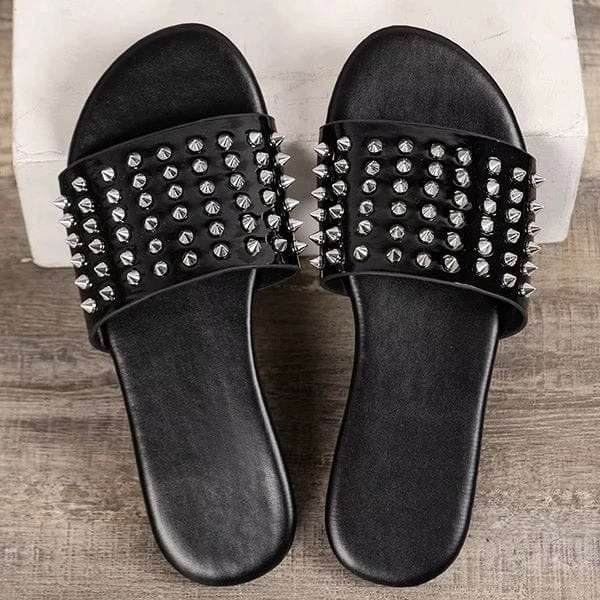 Add a little edge to your look with the Devil’s Spur Leather Studded Sandals! These sleek little slides feature a wide, vegan leather strap adorned in shiny spike-shaped silver studs. Slide-on design for the trendsetter on the go.