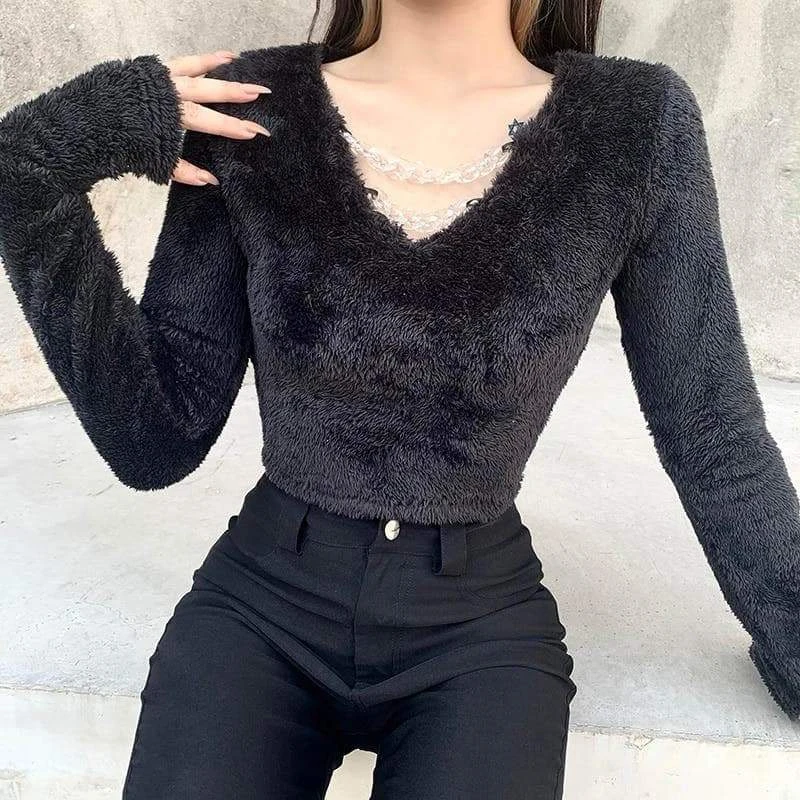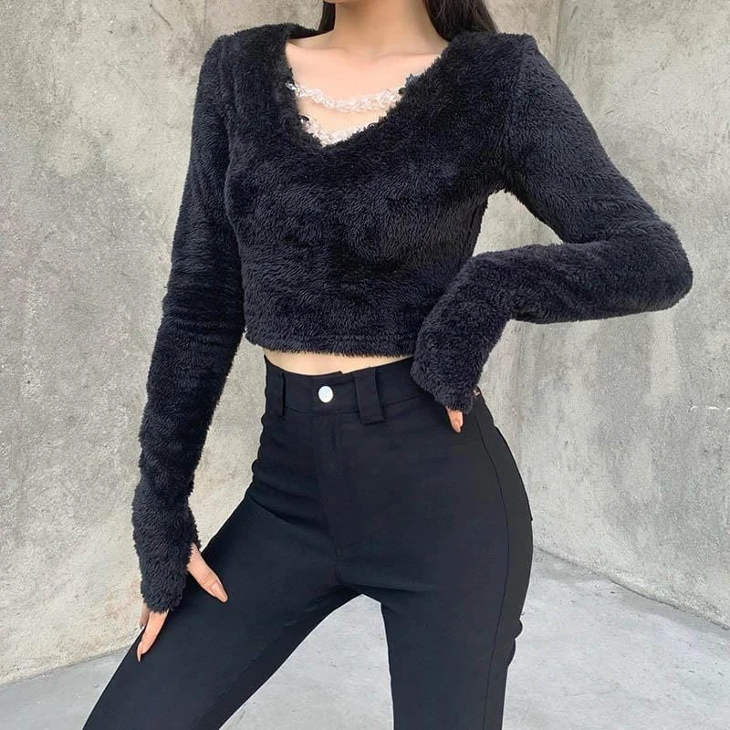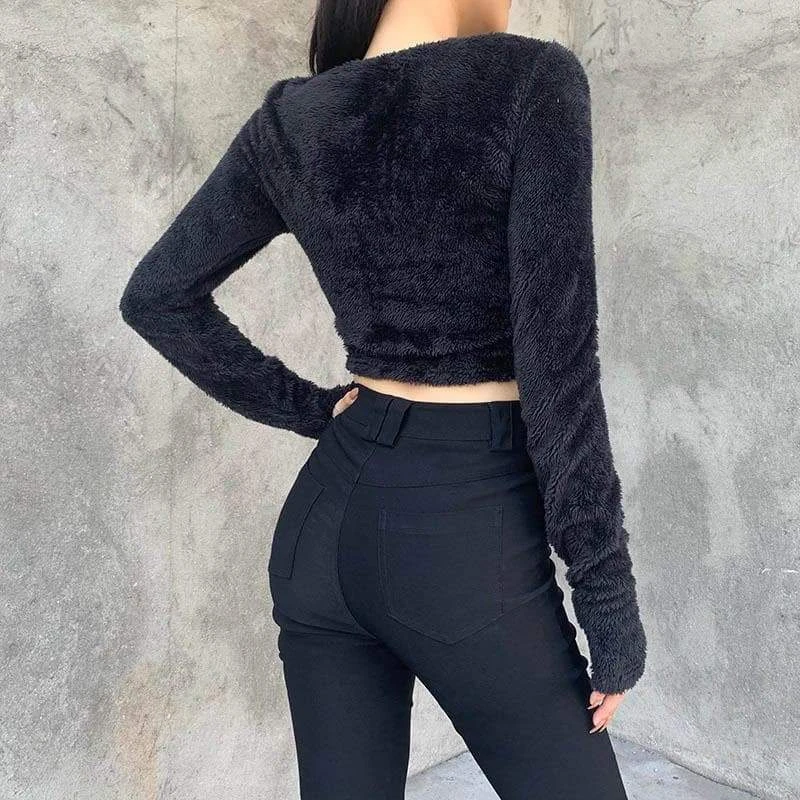 Elegant Chic Harajuku Crop Top cuz you take things to the next level. This black gothic cropped top features a sexy v-neck with chain and a long sleeve with a thumb hole made of broadcloth fabric type.