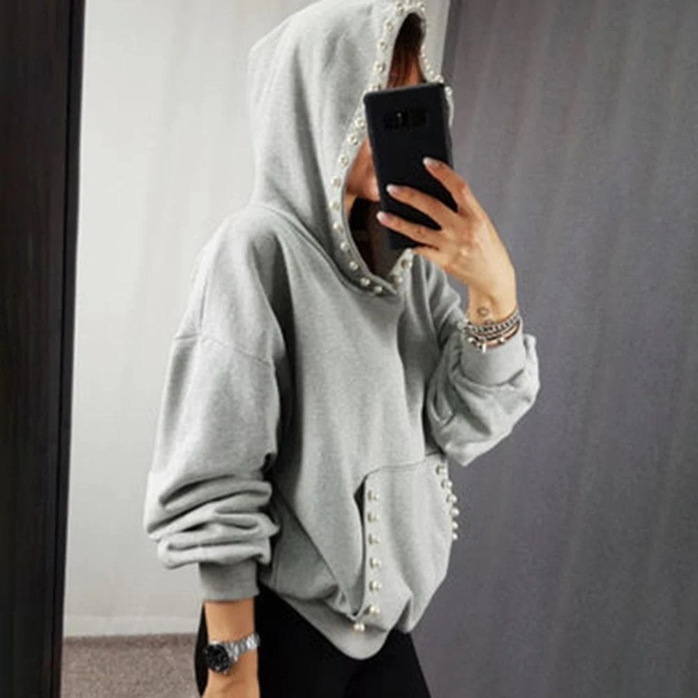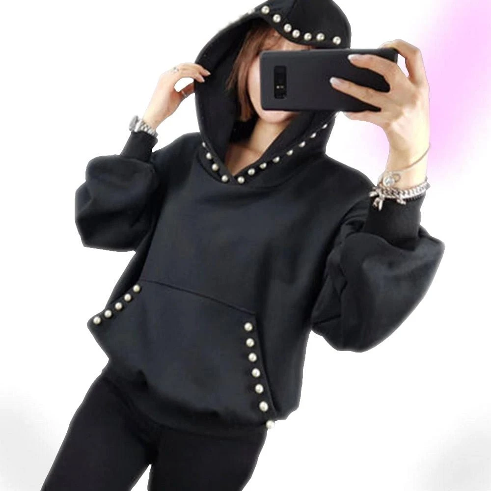 Elegant Lady Gothic Hoodie cuz simplicity is the soul of modern and old-fashioned elegance. This solid pullover hoodie has a beading design along the edges of pockets and hood showing a classy style of fashion.