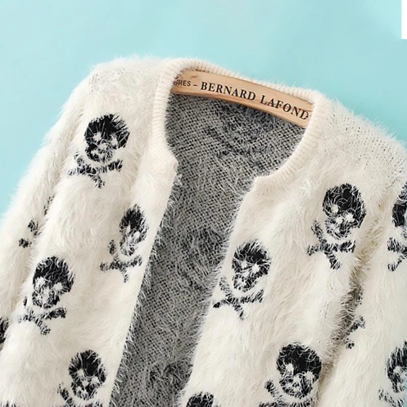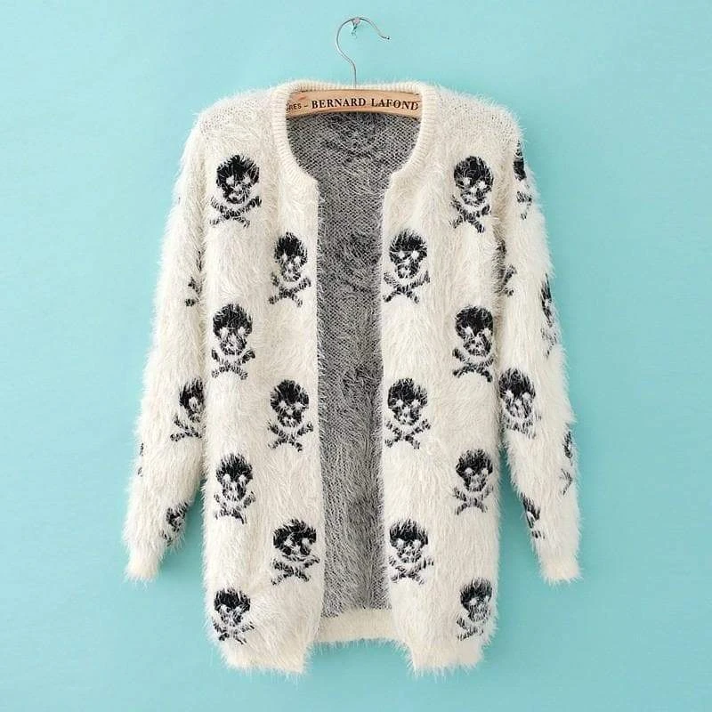 Elegant Skull Punk Coat cuz you’re a bad to the bone babe. This fashion knit wool sweater features its skull head pattern design with a round neck and open stitch closure type.