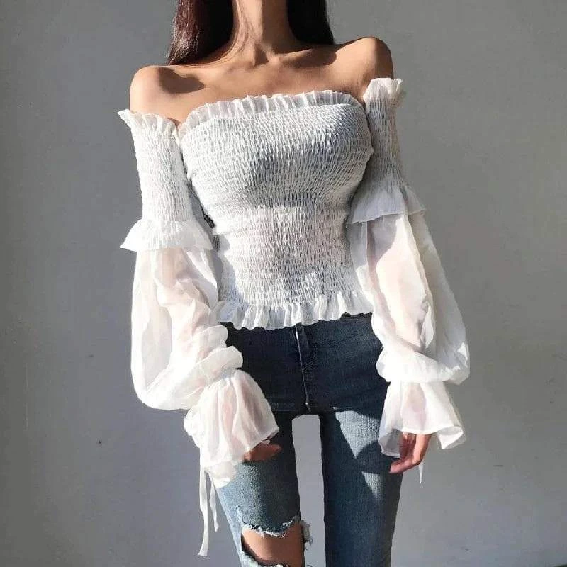 Look cute as hell in the ‘Elvira’ off-shoulder sexy blouse; conjured using a super-soft fabric that stretches to perfection for a flattering yet comfortable fit. Features dramatic long chiffon sleeves – no detail has been spared! This creepy Lil staple piece is a dream to style and looks great with all your fav looks!Â