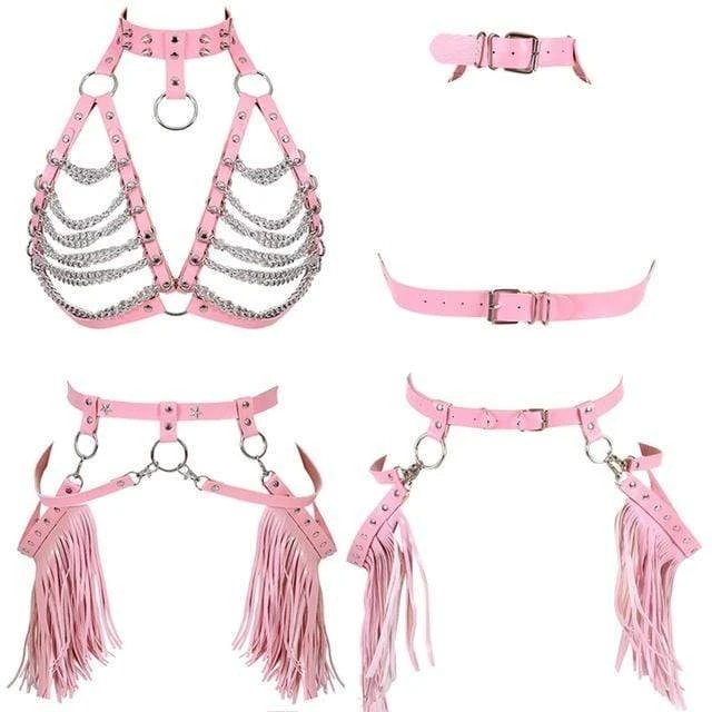 Having a choker inclusive bra, the Exotic Chained Bra Harness is a move on all of them. Available in two more popular colors than ever, black and pink, this harness is all about extra and drama.Â