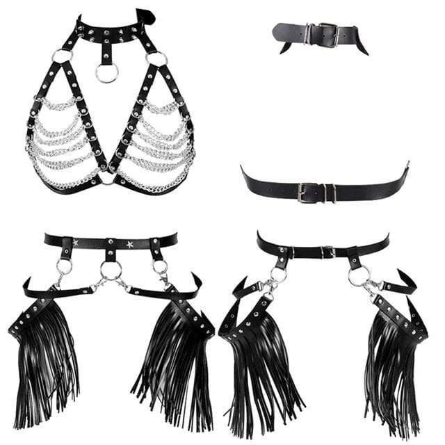 Most of our products are made with a high-quality acrylic, high-quality polyester garters, and nylon garters. Please look at the description above for the specific Gothic harness & garters.