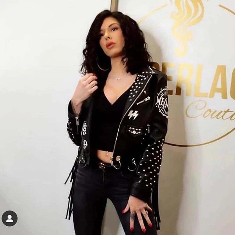 Fancy Punk Leather Jacket gotcha riding the line between right and wrong bb. You’re too good at being bad in this black rivet jacket featuring graffiti prints and fringed designs looking bad AF!