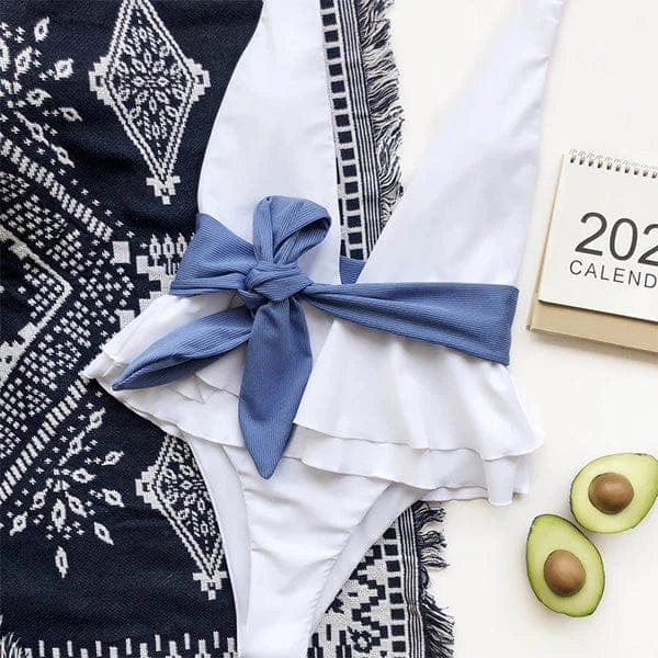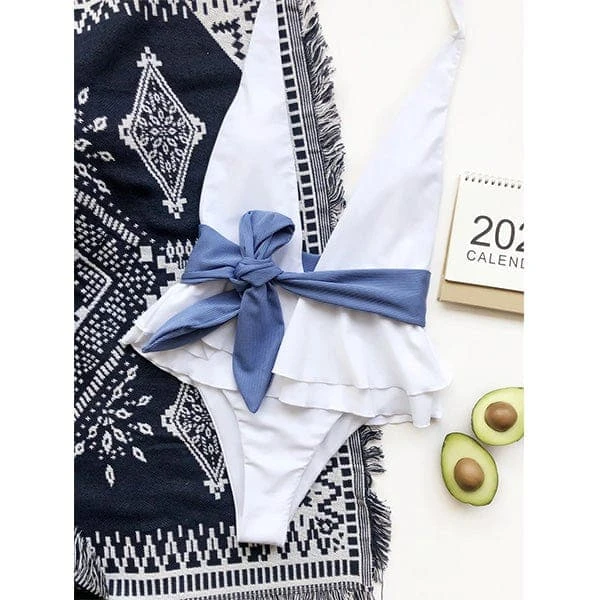 You’re a dream girl! This one-piece swimsuit is made of high-quality nylon fabric, soft and skin-friendly. The solid color V-neck backless swimsuit matches with the tie-up waistband, sexy, simple, and stylish. The tummy ruffles hide your tummy for a more slender appearance.