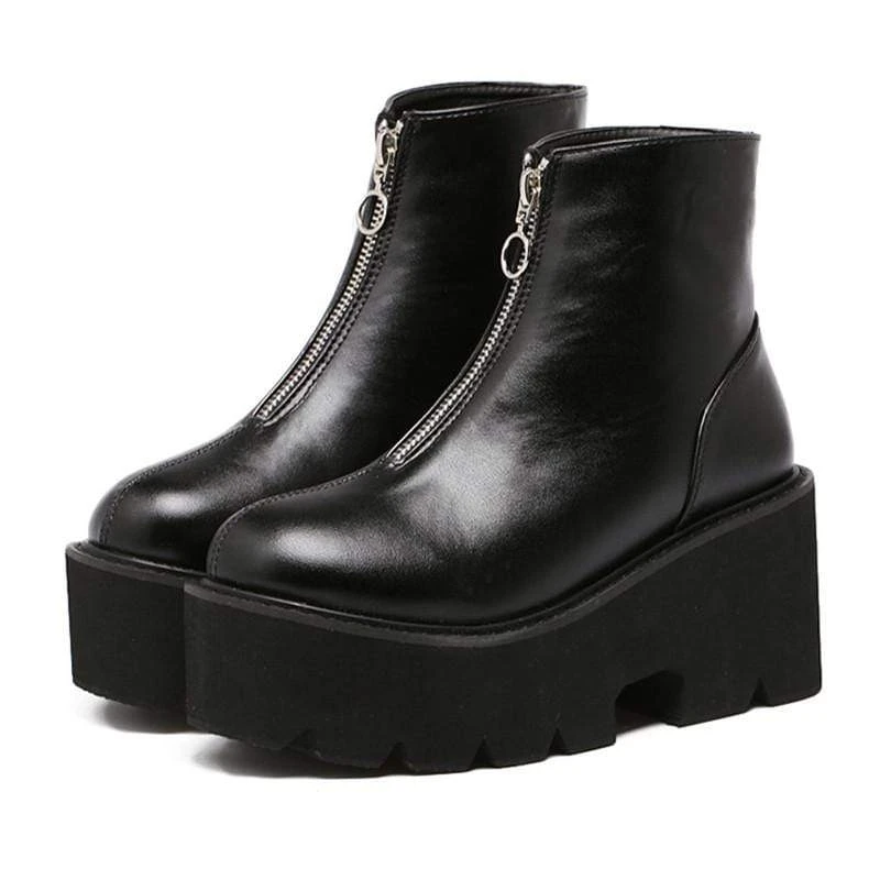 Current Mood Franky Platform Boots cuz yr kickin’ it on the curb, gettin’ ready to start sum shit. Stomp ‘em in these sikk platform boots, featurin’ a supple black vegan leather construction, thick block heel ‘N platform, elasticized side for a sleek fit, and exposed zip front closure with an oversized O-ring pull tab.