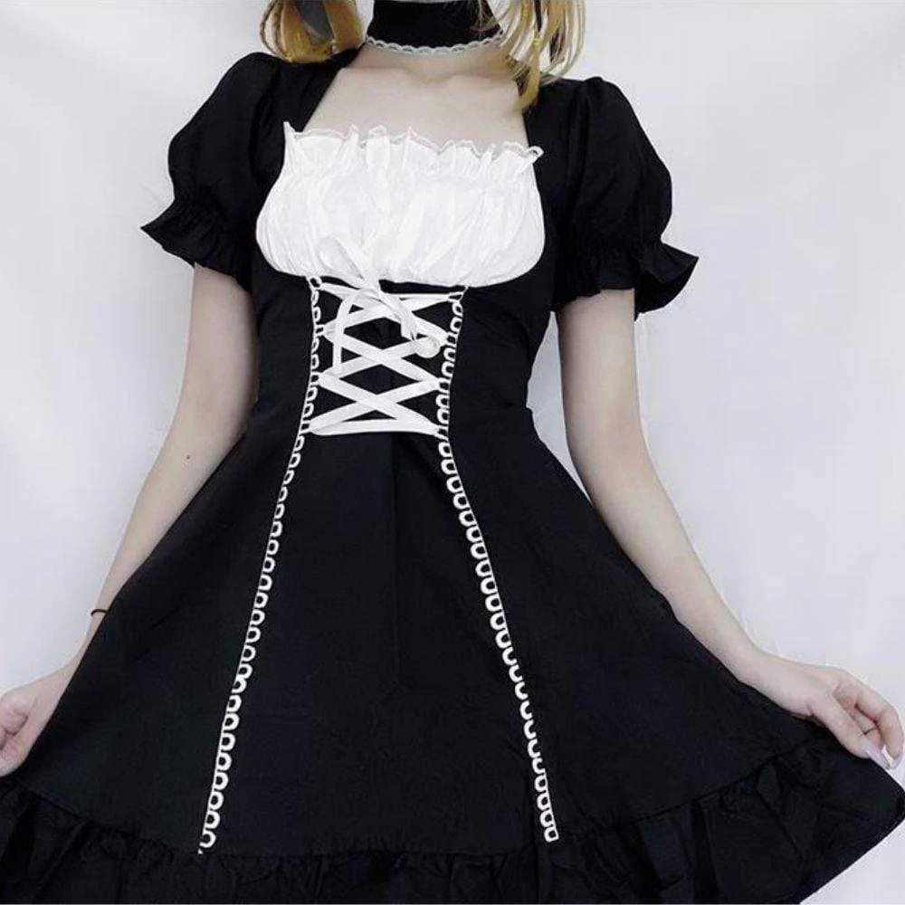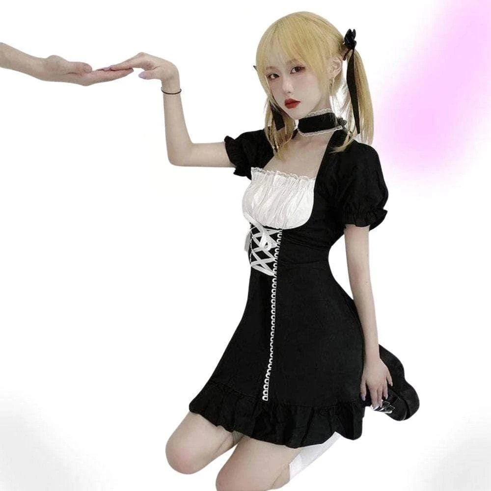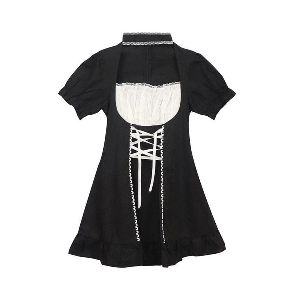 Real-life lolita dress with some charming detailing – bringing you a perfect balance of sweetness to the dark abyss. ‘French Maid’ lolita dress is an ultra-soft fabric dress with cute puff sleeves, cloth choker with lace trims and square neckline with decorative lace. Lace-up empire waistline style to the front for some added drama. Purrfect for play-dates, cosplays and epic foreplay under the moon.