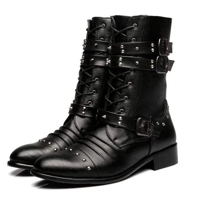 The boots are made of genuine leather along with rivets, stitching and buckle. The heel height is medium and the thickness is something you should experience.