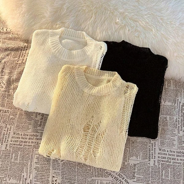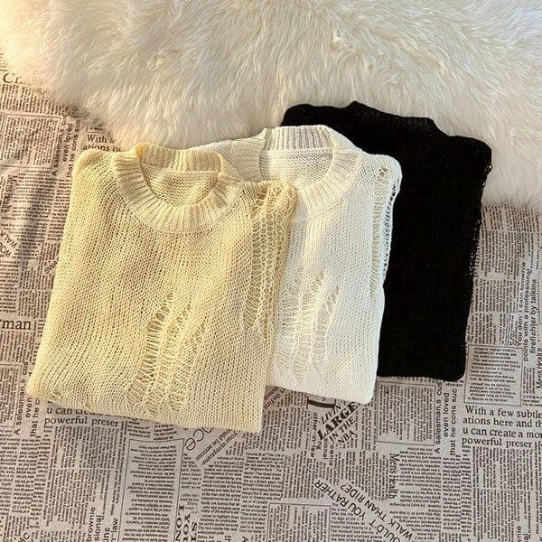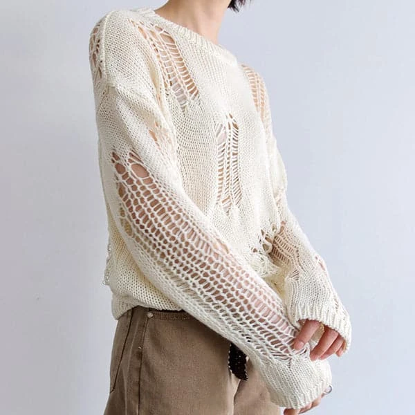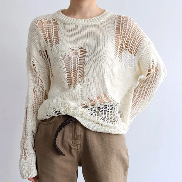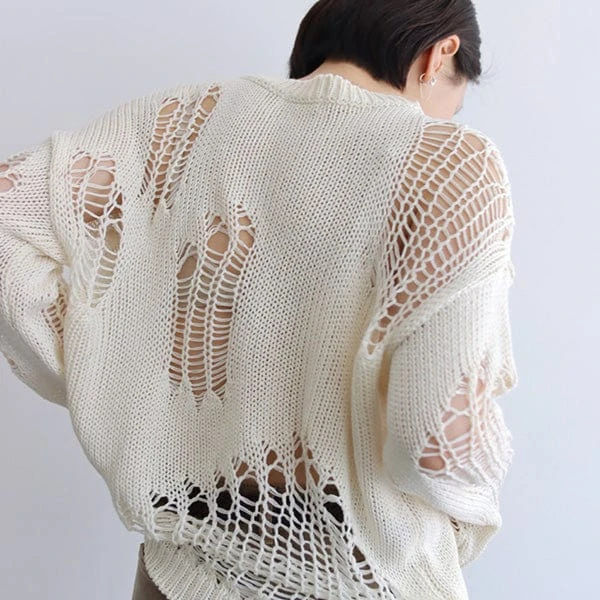 This oversized sweater is spun with a fine fuzzy yarn and is detailed with dropped shoulders and distressed details. Layer yours over a mock-neck long sleeve top in colder weather or over a tank top.