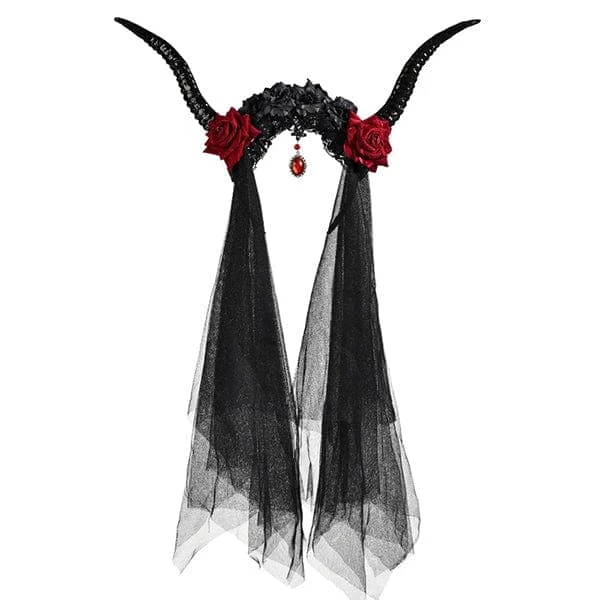 Complete your gothic Lolita outfit with this stunning statement Gothic Antler Horn Headdress for a gothic wedding, Halloween party, or festival. The fantasy headpiece has roses, veils, and a crystal pendant for a mythical and ethereal gothic look.