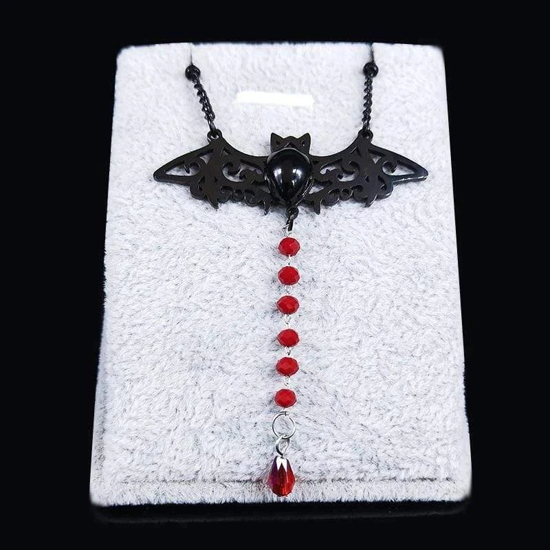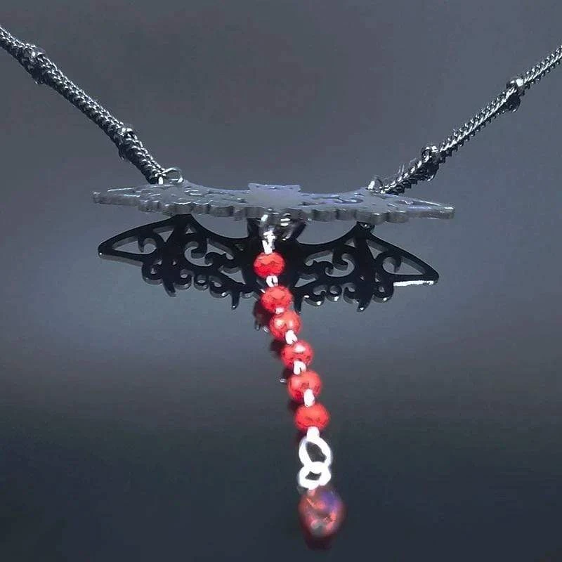 Spread your wings and take to the ink-black skies in this romantic bat necklace! Evoke some Victorian vibes with the large bat pendant, hexed in black finished stainless steel and adorned with red hanging beads that add a bit of magic; dusk to dawn!