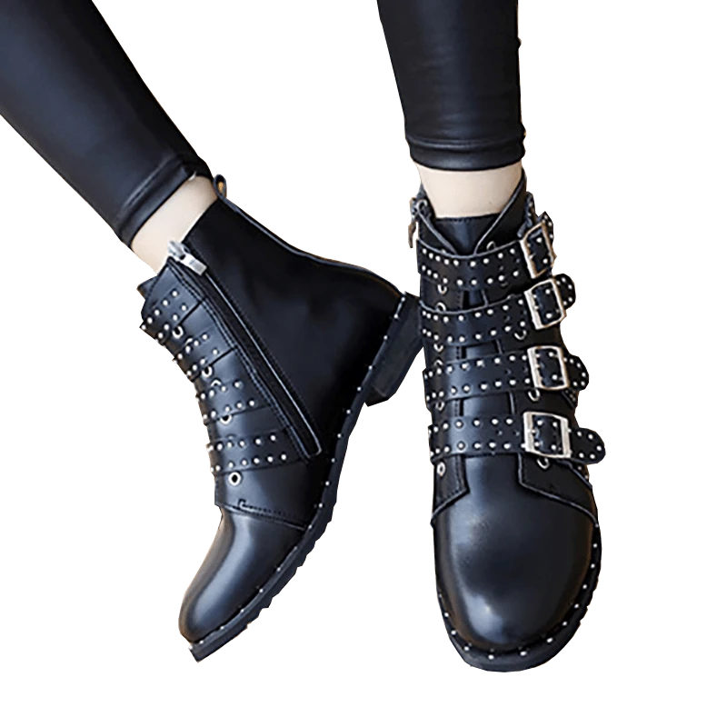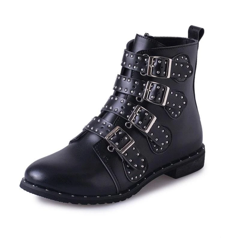 These Gothic buckle boots are all about that Goth life. Look at those studs shining back to you. That PU Leather, Rubber sole and low heels will give you the feel of those rockstars that are absolutely rocking the game. I’m sure you can rock too, slip on these boots and show them how it’s done.Â