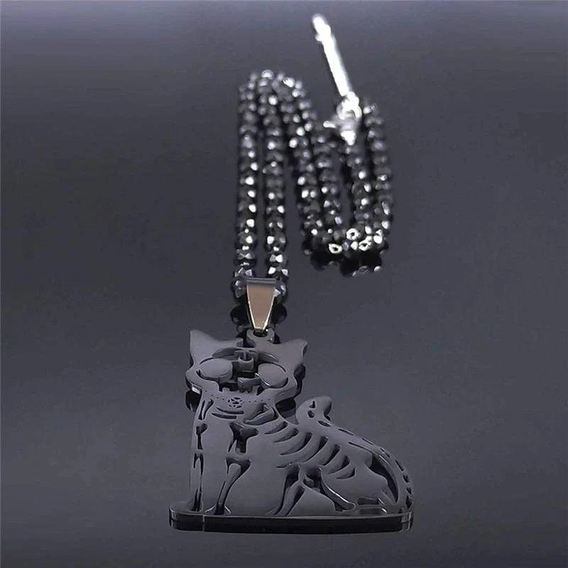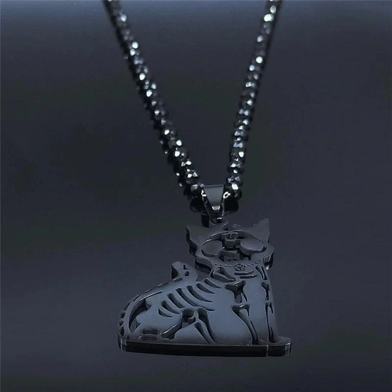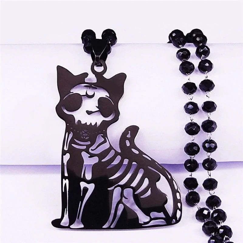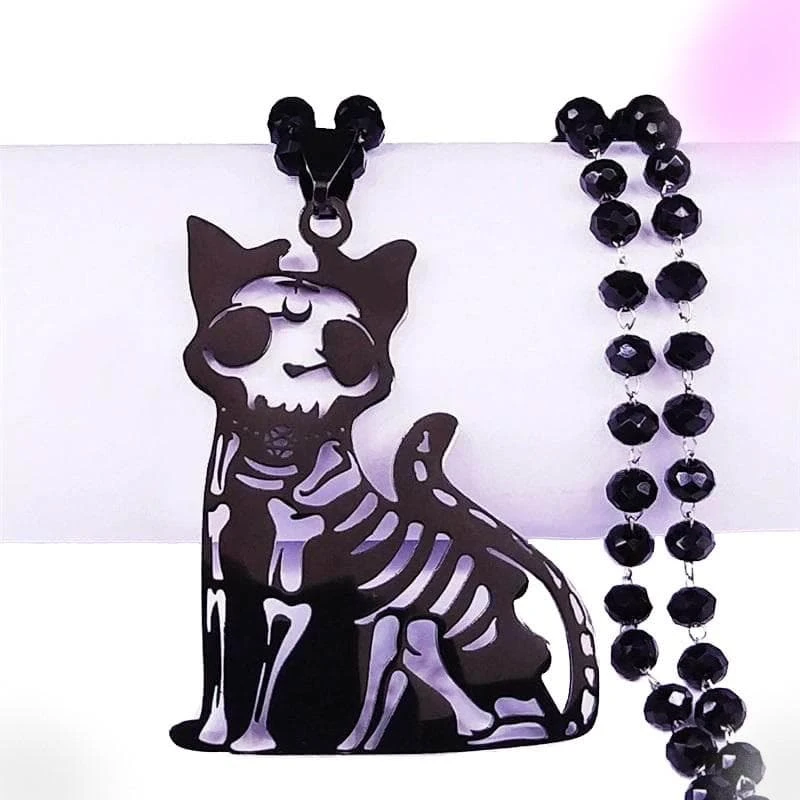 Glam up your outfit without feeling like too much in this Gothic Cat Skeleton Necklace featuring a black skull cat pendant and crystal chain perfect for your goth outfit.