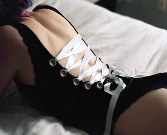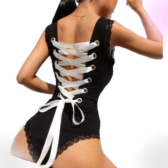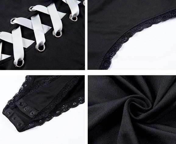 The standout feature is the back with its 12 inset O-rings and the silky white lacing on a form fitting black bodysuit made of polyester and spandex. Further accenting this piece, the boarder edging is all decorated with half inch knitted black boarder lace. Â