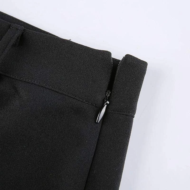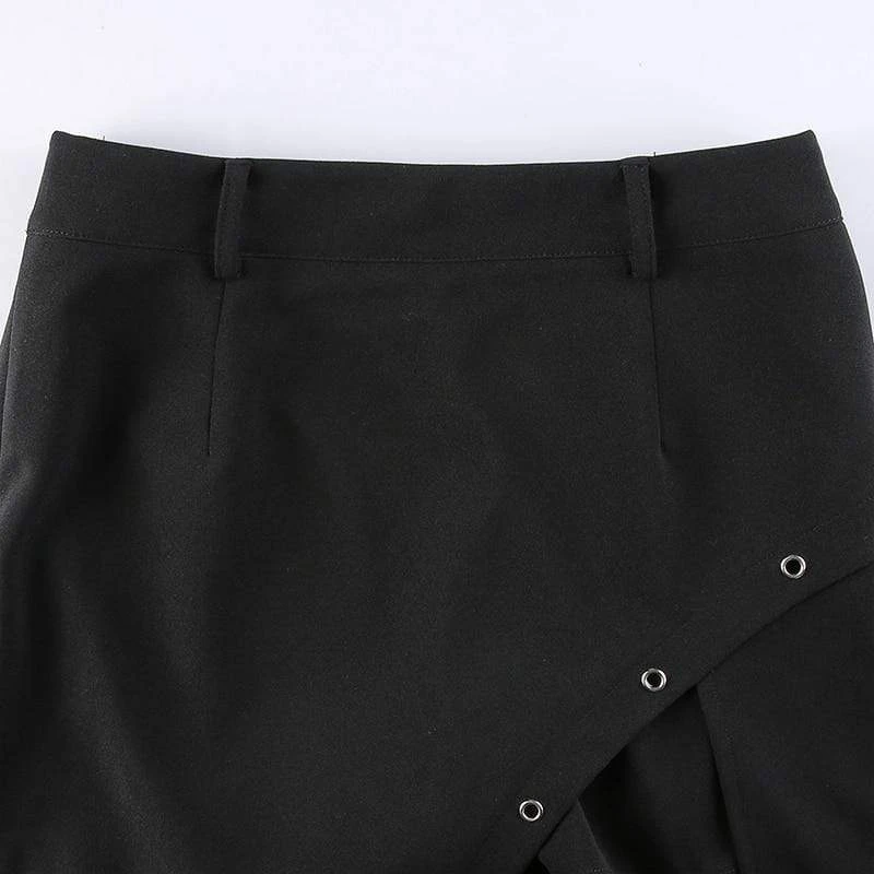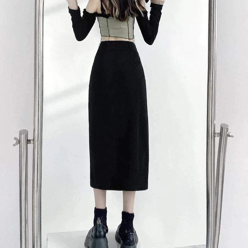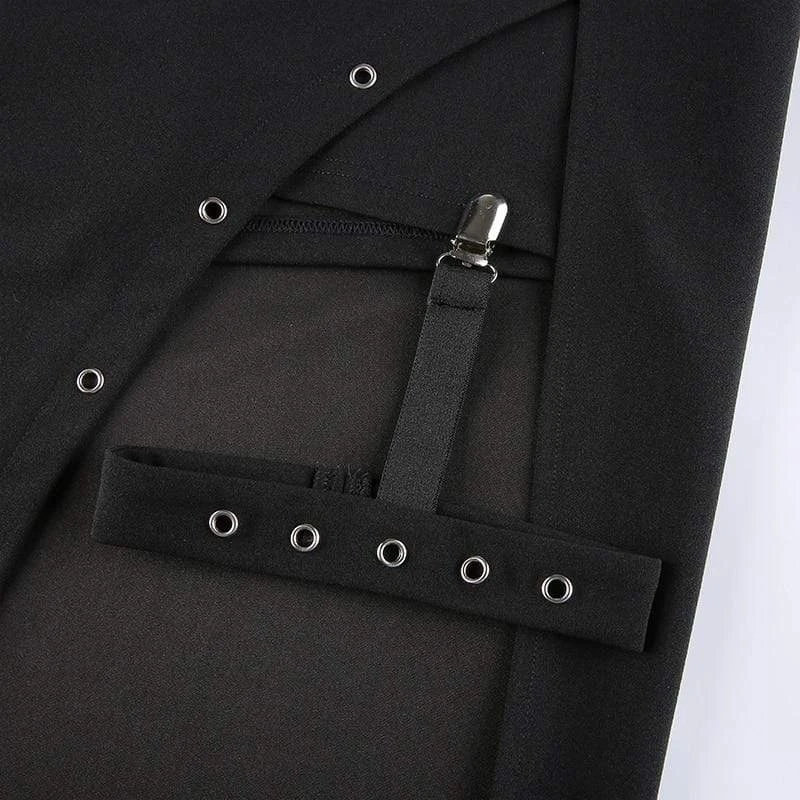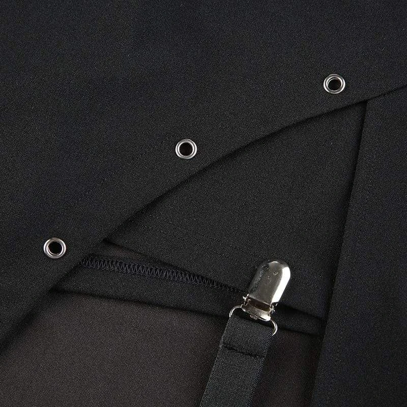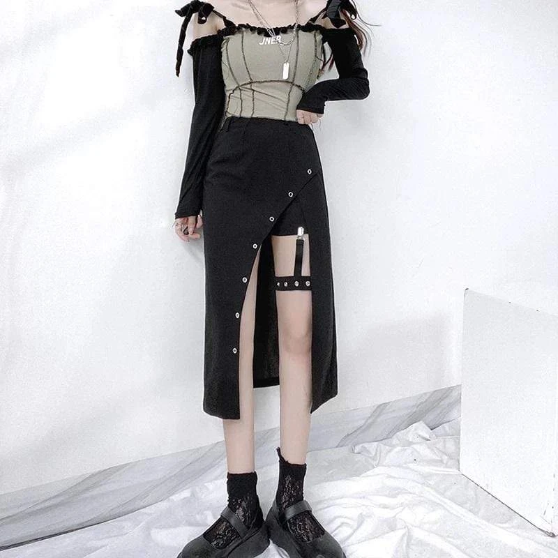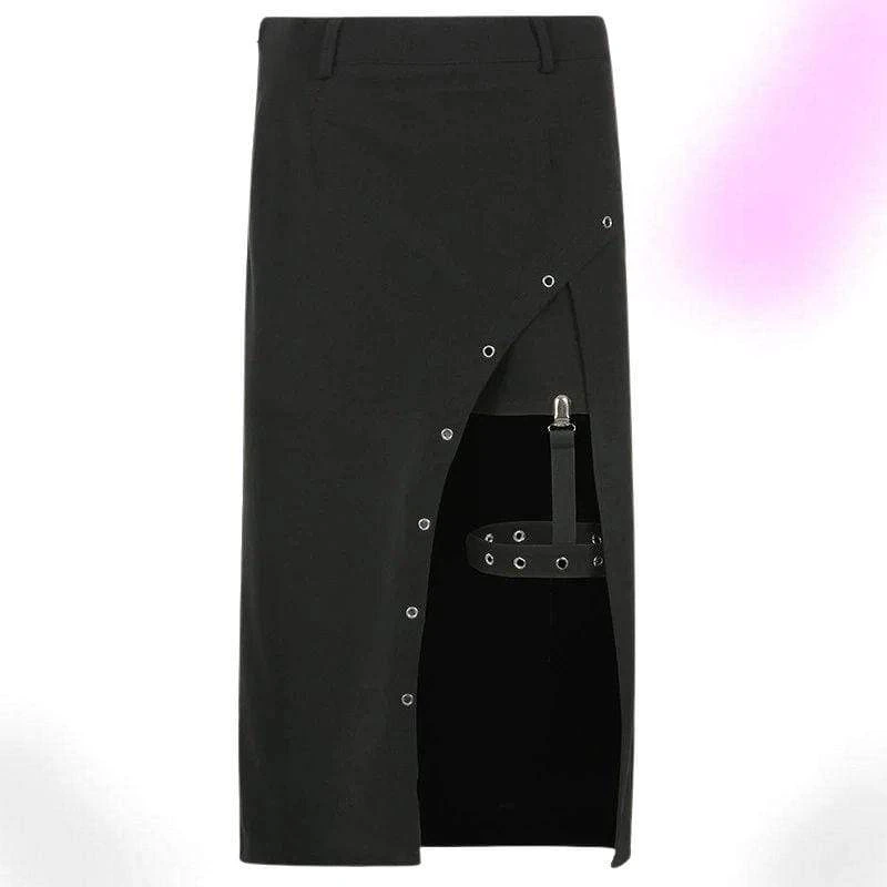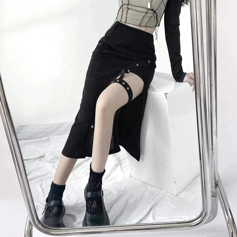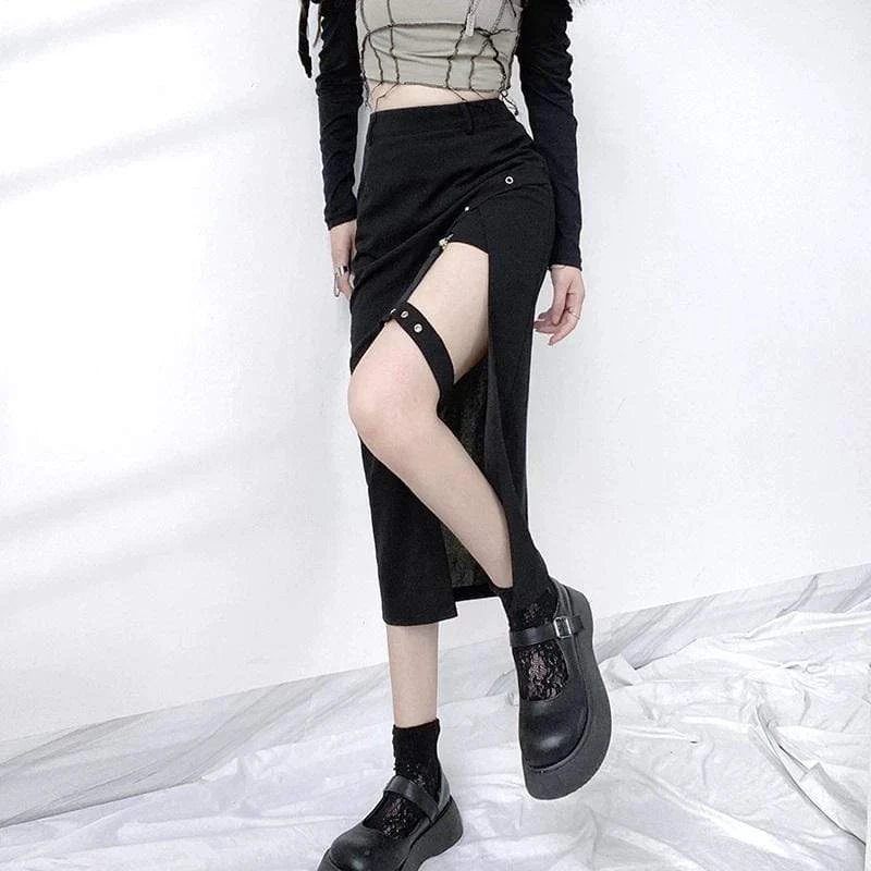 The Harajuku Sexy Long Skirt will tick all yer boxes; featuring a super-stretch woven fabric for a flattering + comfortable fit, guaranteed to keep heads rollin’ when yer out! With a hip-high slit, statement suspender strap, and adorned with rivet holes ready to match your killer boots!
