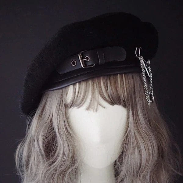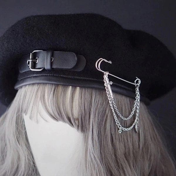Here’s to nailing it. This cap features a soft, flat top, a band with leather buckle detailing, and an attached chain with gothic charms at the side.
