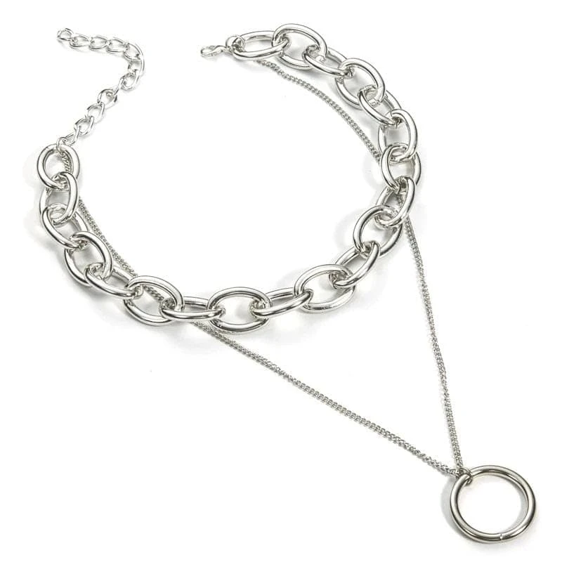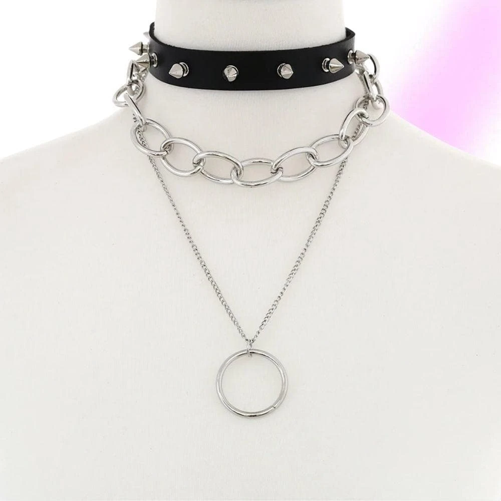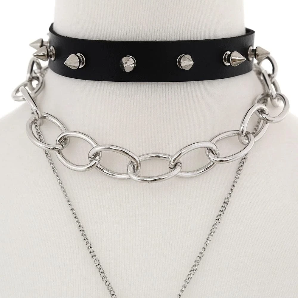 Hate Me Not Choker Necklace Set comes in 3 layers of fun, includes a vegan black leather choker with spiky studs, a big chain mid-necklace, and a small long chain with a big O-ring.