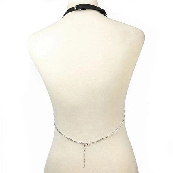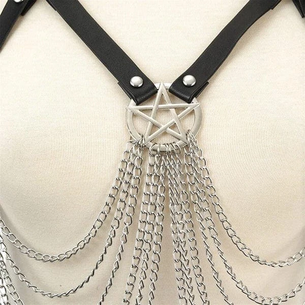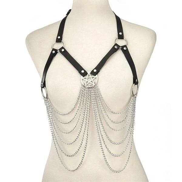 Experience the unique wearing sensation and hypnotizing looks of a stunning Heavenly Body Harness. This body chain is made of PU leather and aluminum chains attached in a pentagram.Â