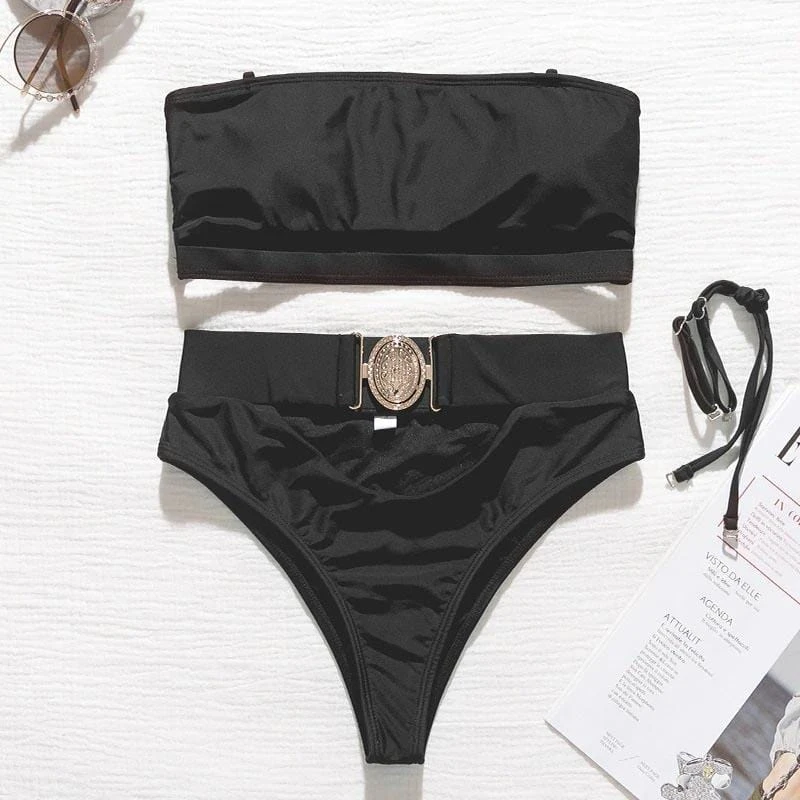 We have here, our Hollow Belt Swimsuit in two stunning colors. The black one is a dual color to add more dimesion to the swimsuit. The belt is the main attraction with its bold brooch.Â