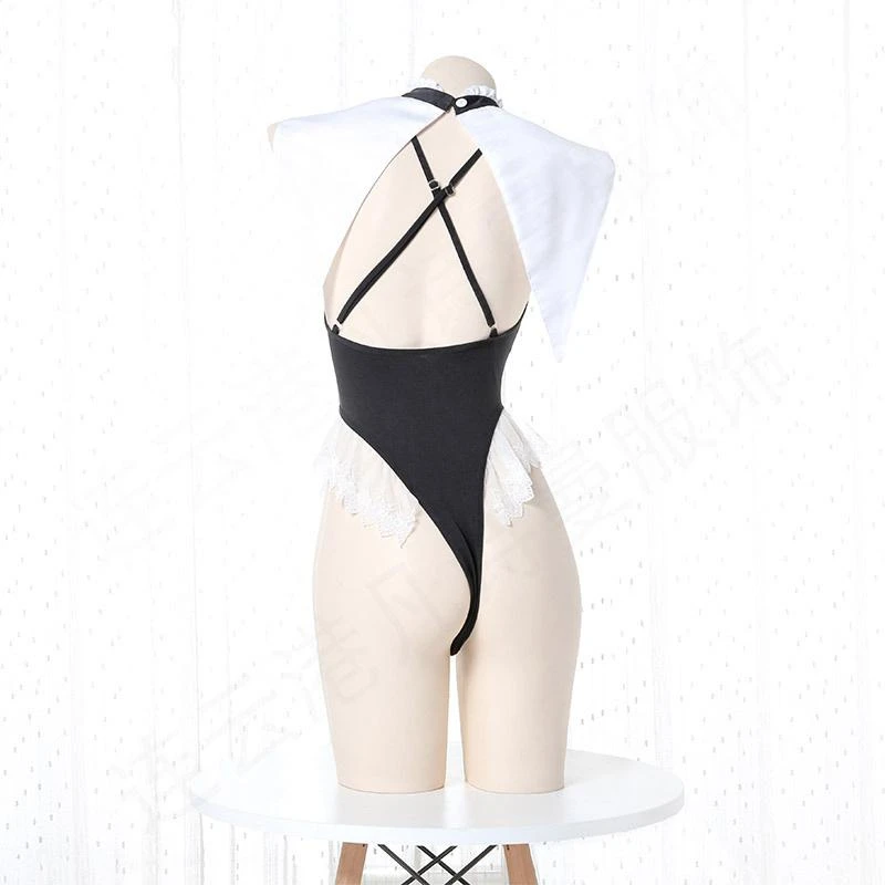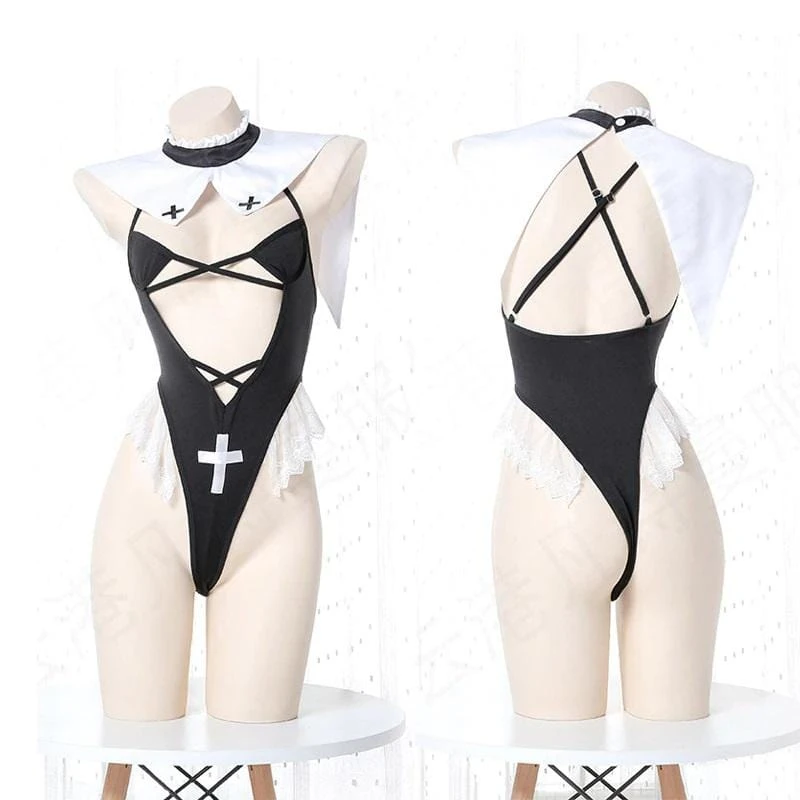 According to some people, Christ left the chat when you decided to turn to the “path of the devil” (#gothlife). So why not invite a bit of it back into your life, but sexier? Crosses adorn the lapels of the imitation cloak collar with another on the belly of this sexy black bodysuit sandwiched in between the lacy white ruffles that edge the waist high cut thighs.