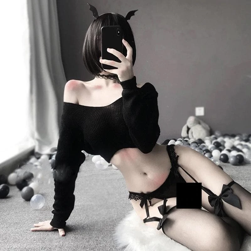 Kawaii Fiend Seduction Lingerie cuz u got some killer good looks, bb! This cute naughty lingerie features 2 variants, angelic and devil, it has a v-cut long sleeve crop top, lace thong, and adorable headbands.