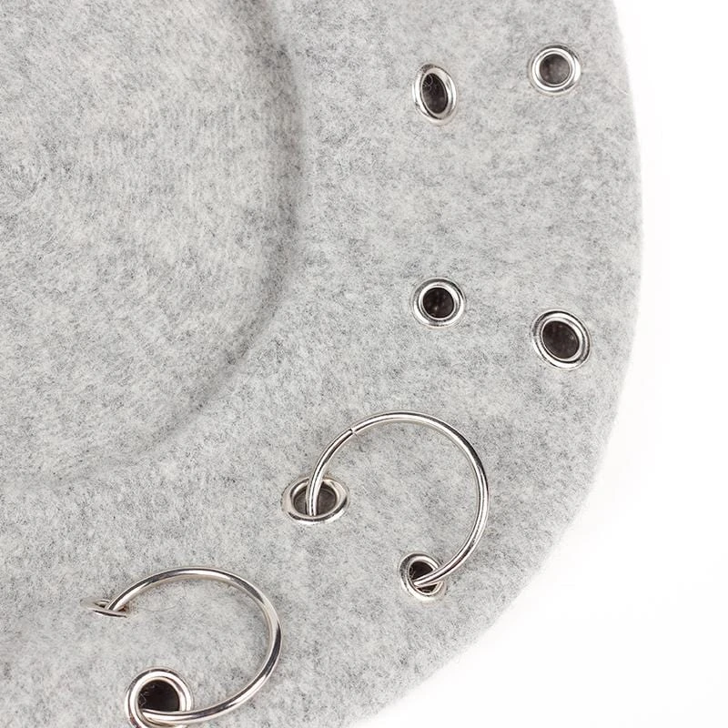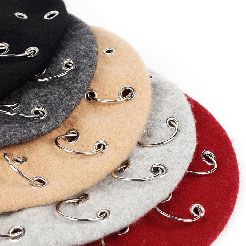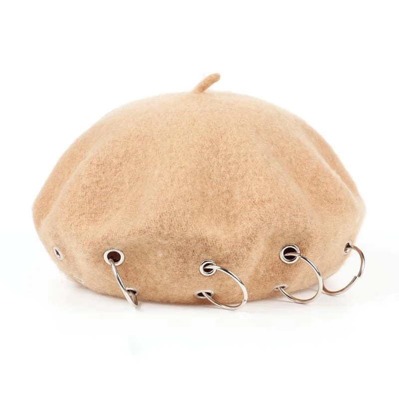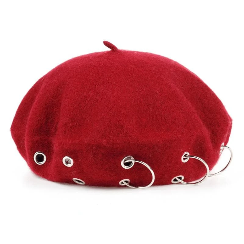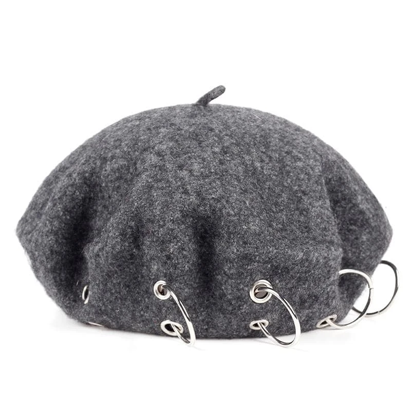 Inject some instant glam to your wardrobe with this Klarita Harajuku Woolen Beret. Made with woolen fabric possessed with statement metal iron rings, this bold and beautiful beret is dead-set on adding a bit of drama to your ‘do. You go goth girl power!Â