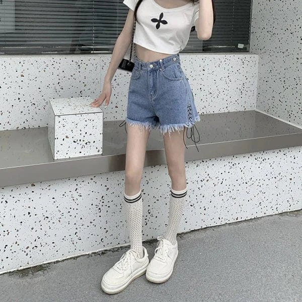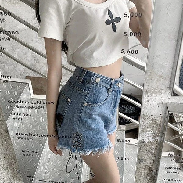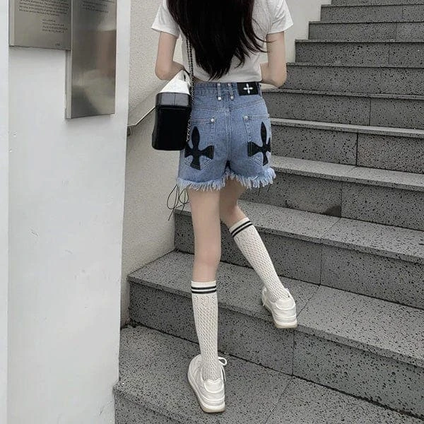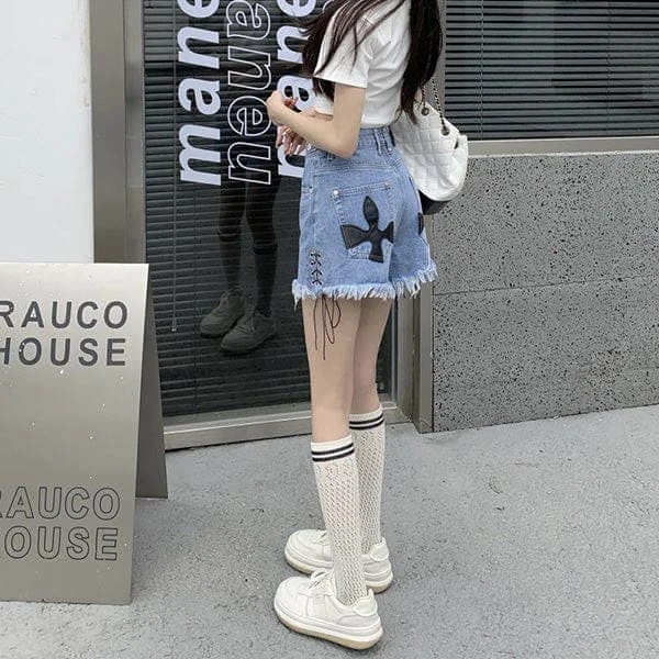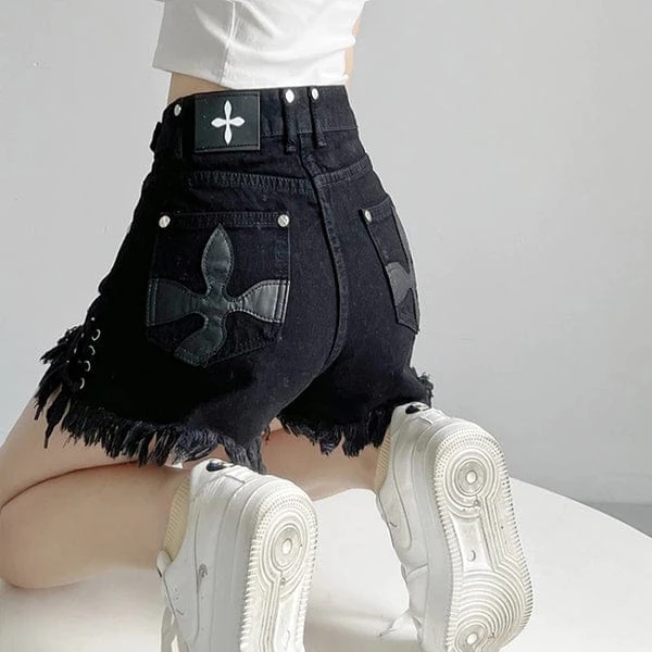 Denim any night of the week with the Lil Freak Fringe Denim Shorts. Loose fit with adjustable drawstrings on the sides, 5-pocket styling with cross patches on back pockets, raw hems, high waist, and zip details. A perfect core piece and a must-have for your dark wardrobe!Â