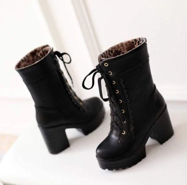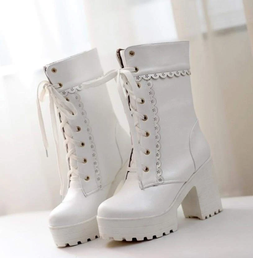 Stomp it out in these cute high-heel boots that have clover feel design on it with a chunky platform heel and laces. The lace up closure and round toe along 3-5 cms. height will keep you cute and creepy.Â