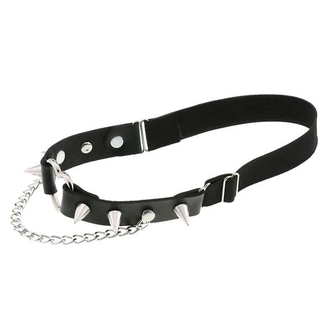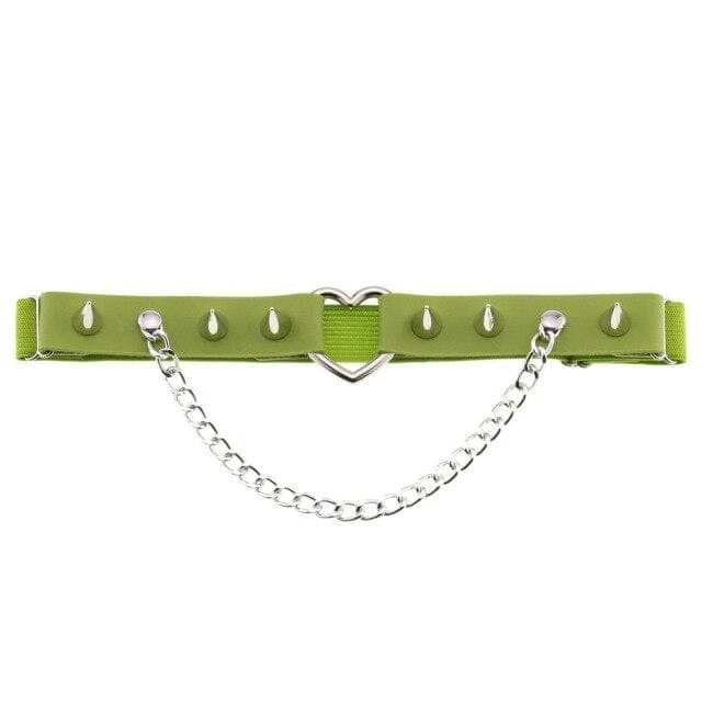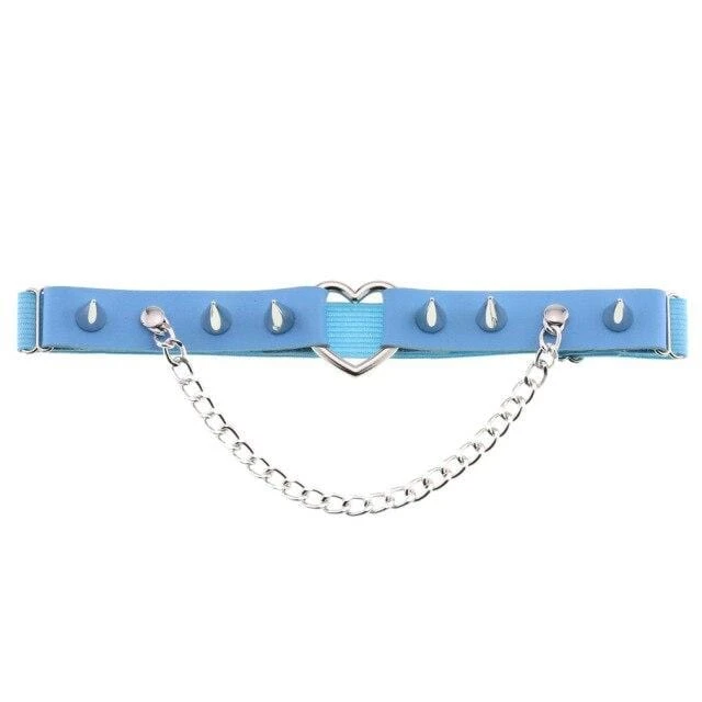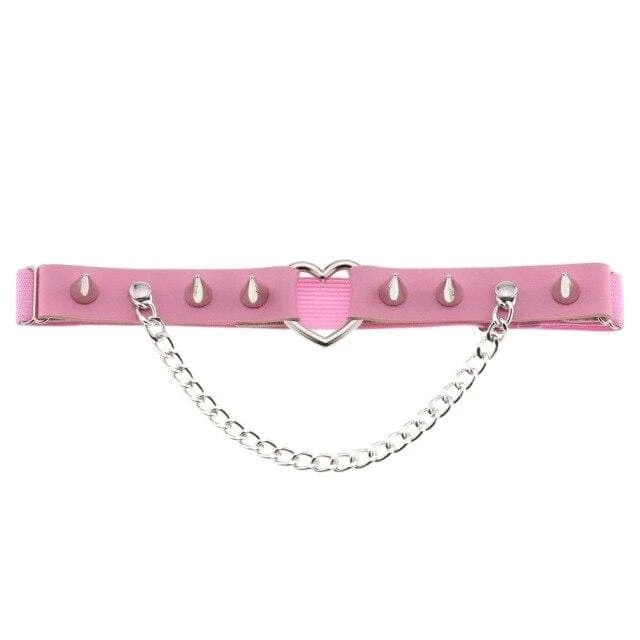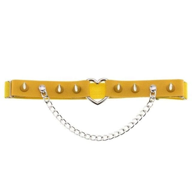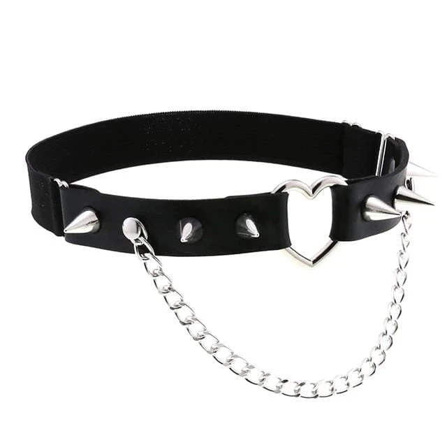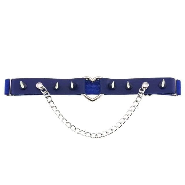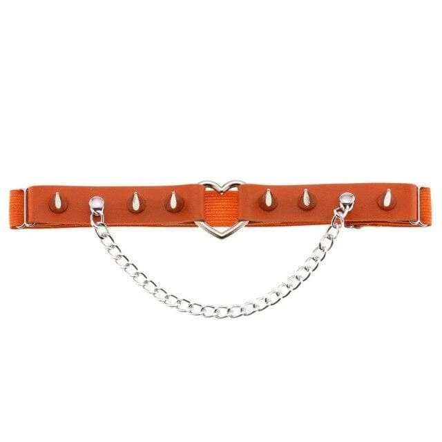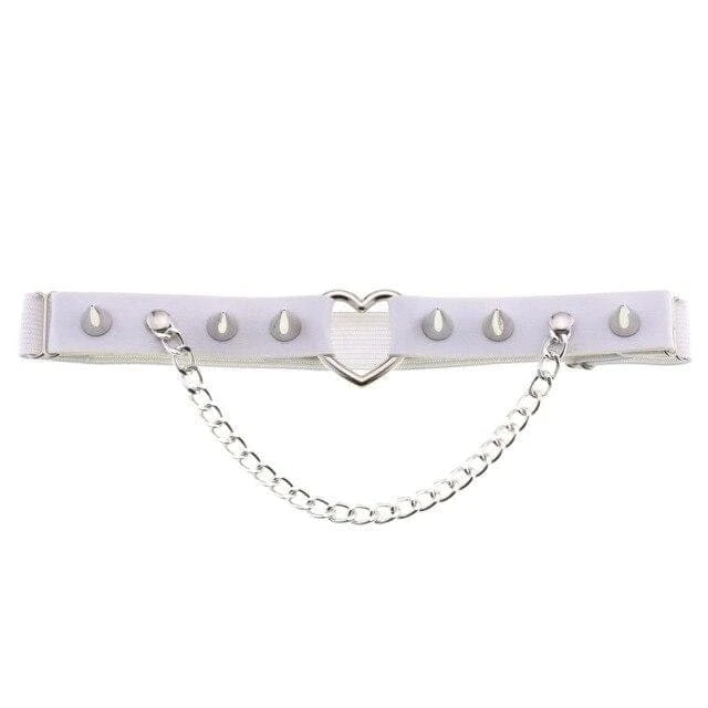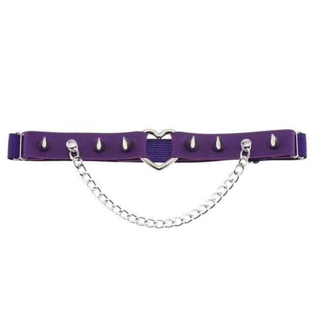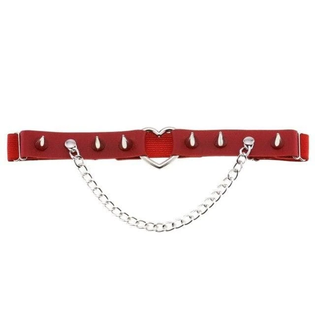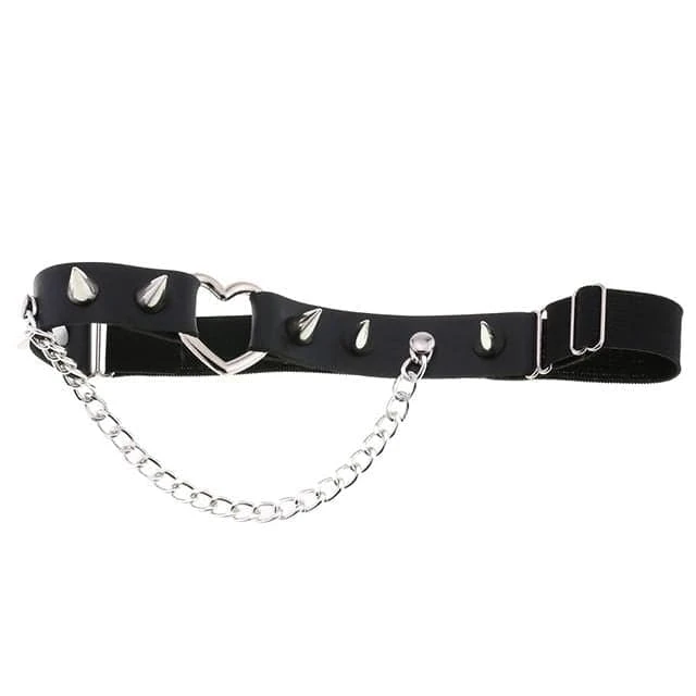 Cute and playful heart leg garter – a perfect combination of faux leather and statement heart hardware. With adjustable elastic back, spike stud details, and chain.Â