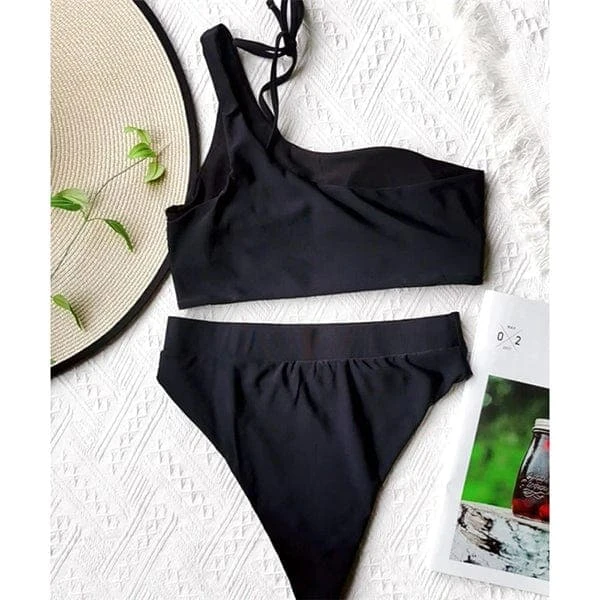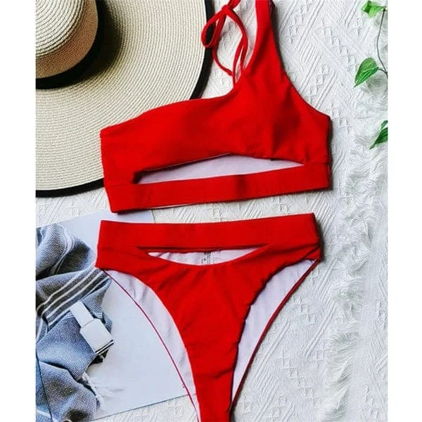 Slip into undeniable luxury with this soft and sexy two-piece swimsuit. Designed with trendy cut-out details, this oh-so sultry bikini set features a flirty one-shoulder bikini top and sexy bottom. Comes in black and red only.Â