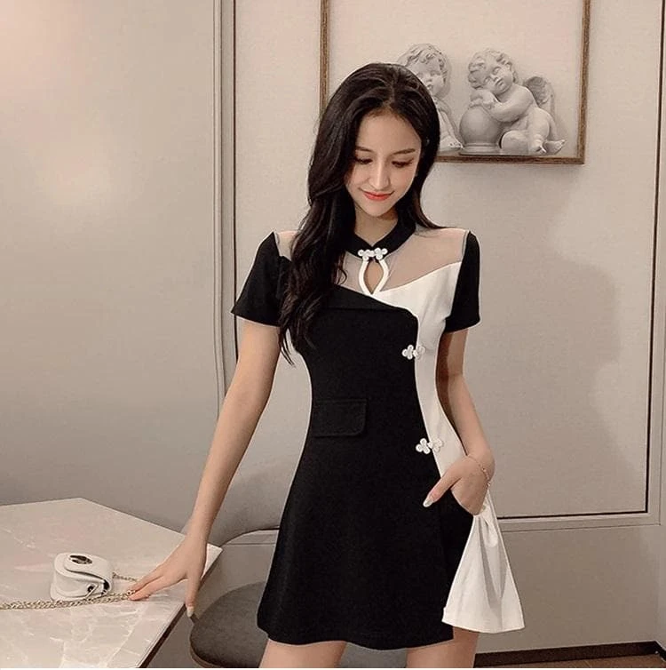 You’re a pretty pagan in this black and white Mandarin Style Two-Piece Dress Set, made in hell for darling demons! Conjure some occult with the white mesh and statement Chinese knot buttons. A high-waist and a-line cut to flatter your figure!