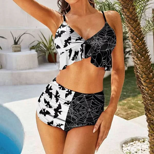 Embrace your dark side with the Midnight Dip Bikini. This striking two-tone swimsuit features a gothic-inspired bat and web design, various color combinations, a comfortable fit, and a bold look. Perfect for adding an edge to your swimwear collection.
