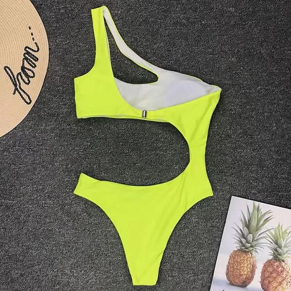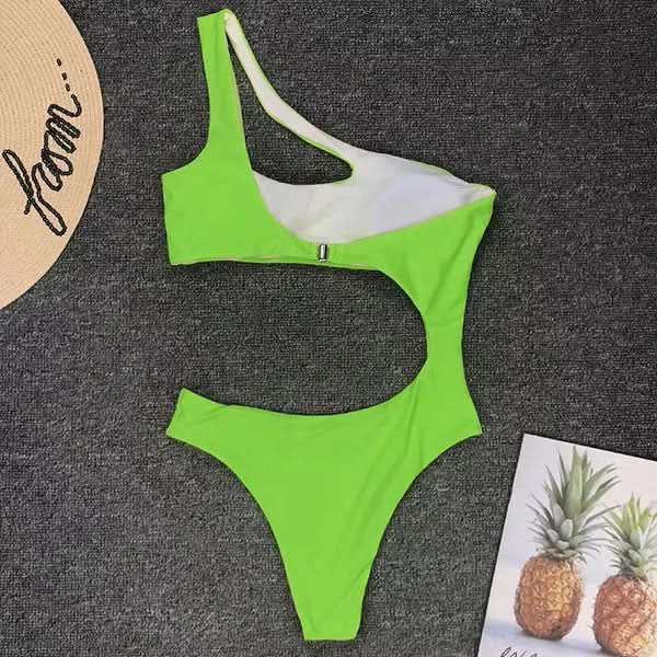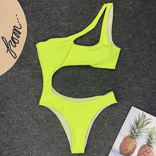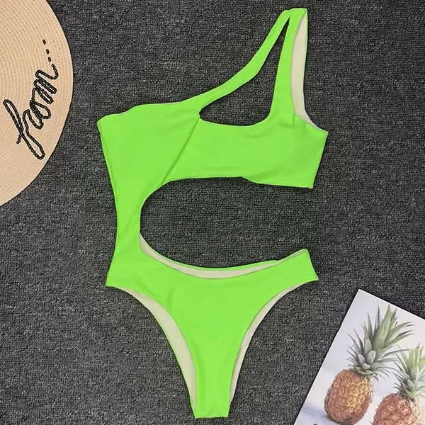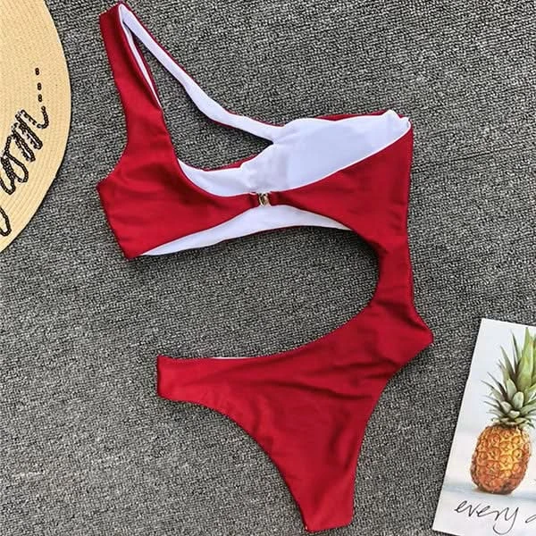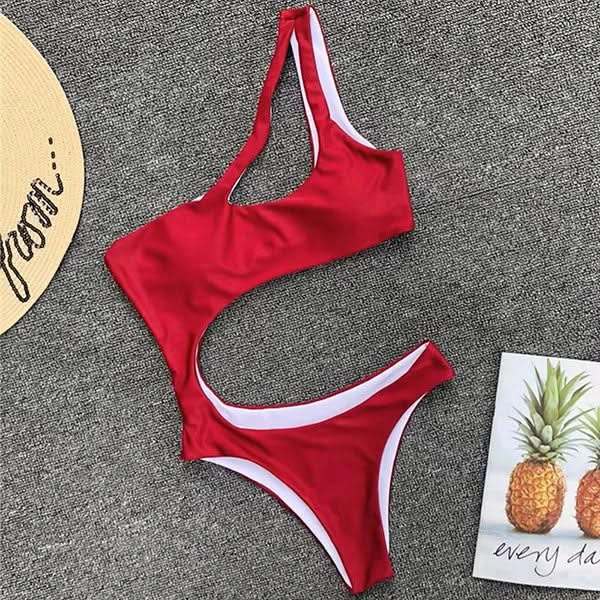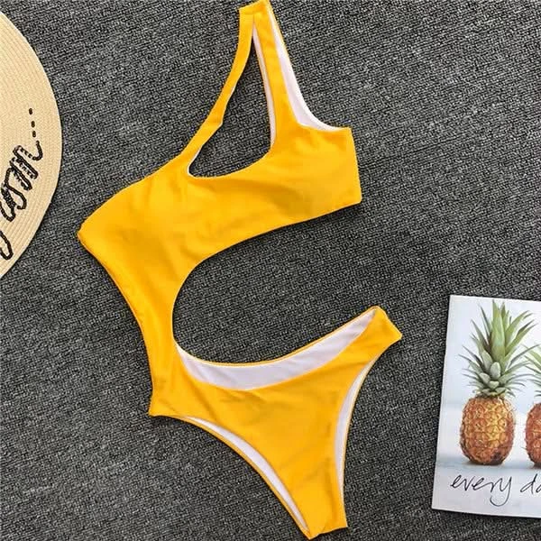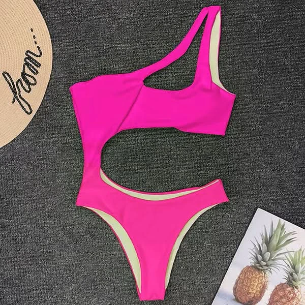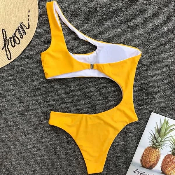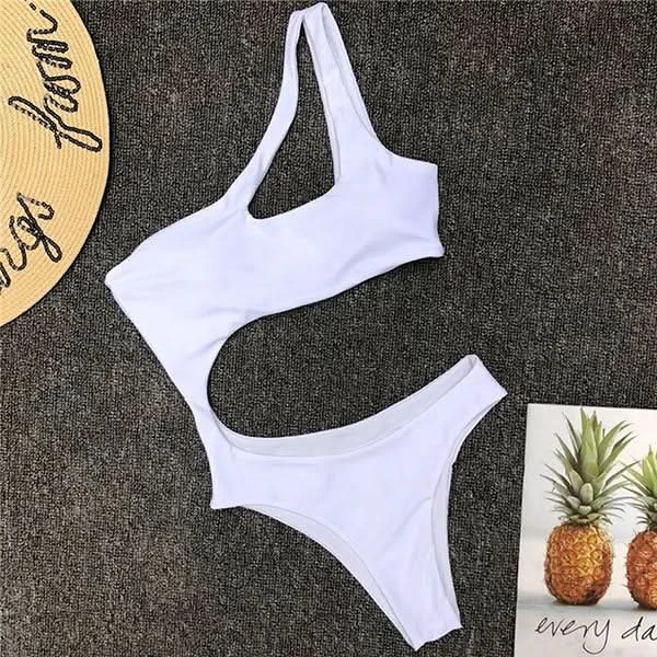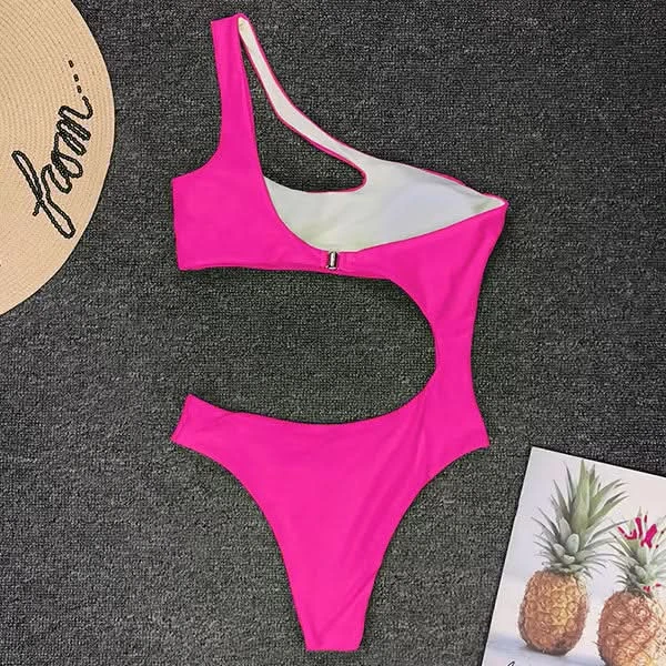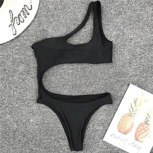Make a statement in the Midnight Muse one-shoulder swimsuit. This sleek black monokini features a daring high cut and unique asymmetric design. Made with comfortable polyester/spandex. Perfect for poolside glamour.