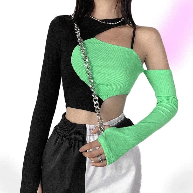 It’s a hot girl in hell! This crop top has a ribbed knit material for superior comfort and fit. Features a color block of black and light green, long sleeves with one cold-shoulder design, and an asymmetrical hem, statement cutouts, sinfully sexy to please your heathen heart. Â