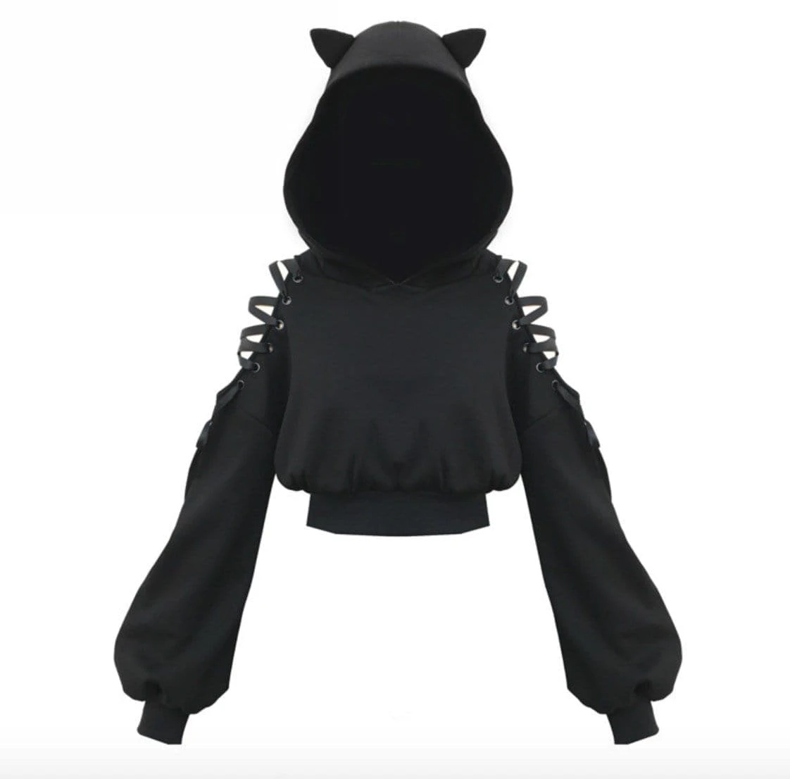 This Cat Ear Hoodie hit the bad kitty scene ferociously! This unique hoodie is customized with strappy opened shoulders, an elastic short cut torso, and the iconic cat ears perked up showing exactly who is the boss.