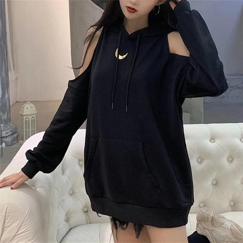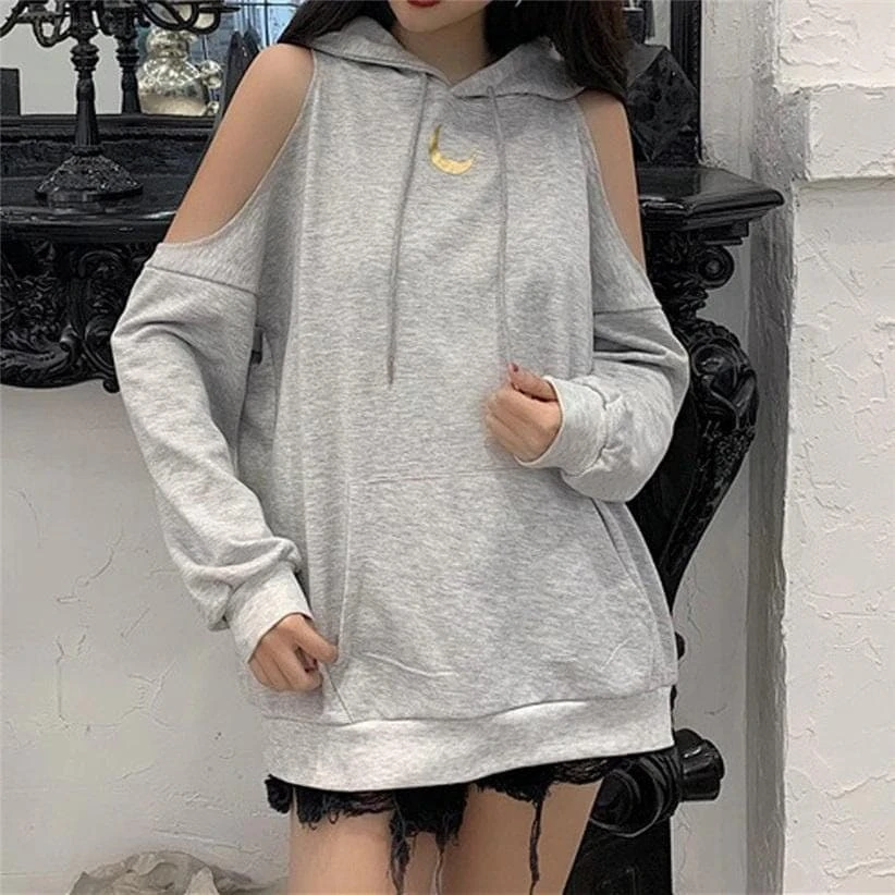 Command the moon at tonight’s ritual in the Moon Mystery Cold Shoulder Hoodie. Walk under the moonlight with the oversized hoodie with cold shoulder sleeves, and golden moon in front. Leave ’em starry-eyed in the soft and snuggly construct, made for midnight promenades.