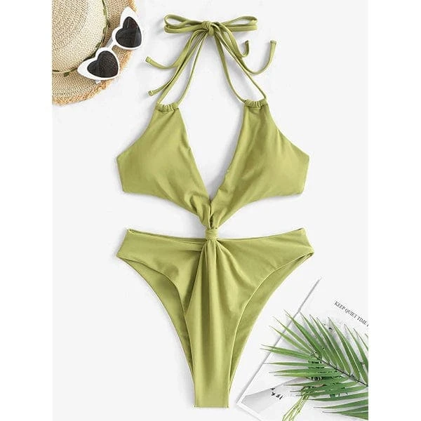 Sculpt and show off your curves with this Knot One-piece Swimwear. Crafted from a super high-stretch and comfy nylon-spandex blend, it’s easy to slip into, and you won’t feel like you’re being strangled! With a halter neck and high waisted fit, it’s the must-have piece for your beachwear wardrobe. Plus, removable pads ensure a customized feel. Get ready to be the belle of the beach!Â